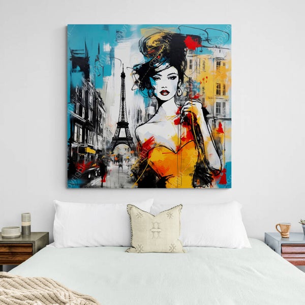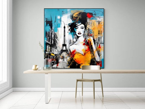 Schilderij vrouw in Parijs, Eiffeltoren, abstract, graffiti stijl, kleurrijk, kunst | Frankrijk, vierkant, Herman Brood, oranje, rood, blauw, modern