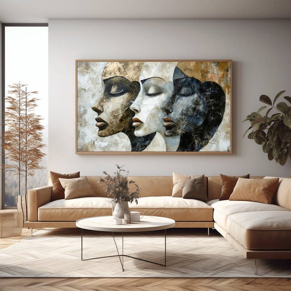 3 Vrouwen, portret,, abstract, surrealisme, gecraqueleerd, kunst | gezicht, mens, bruin, zwart wit, bruin, oog lippen, modern