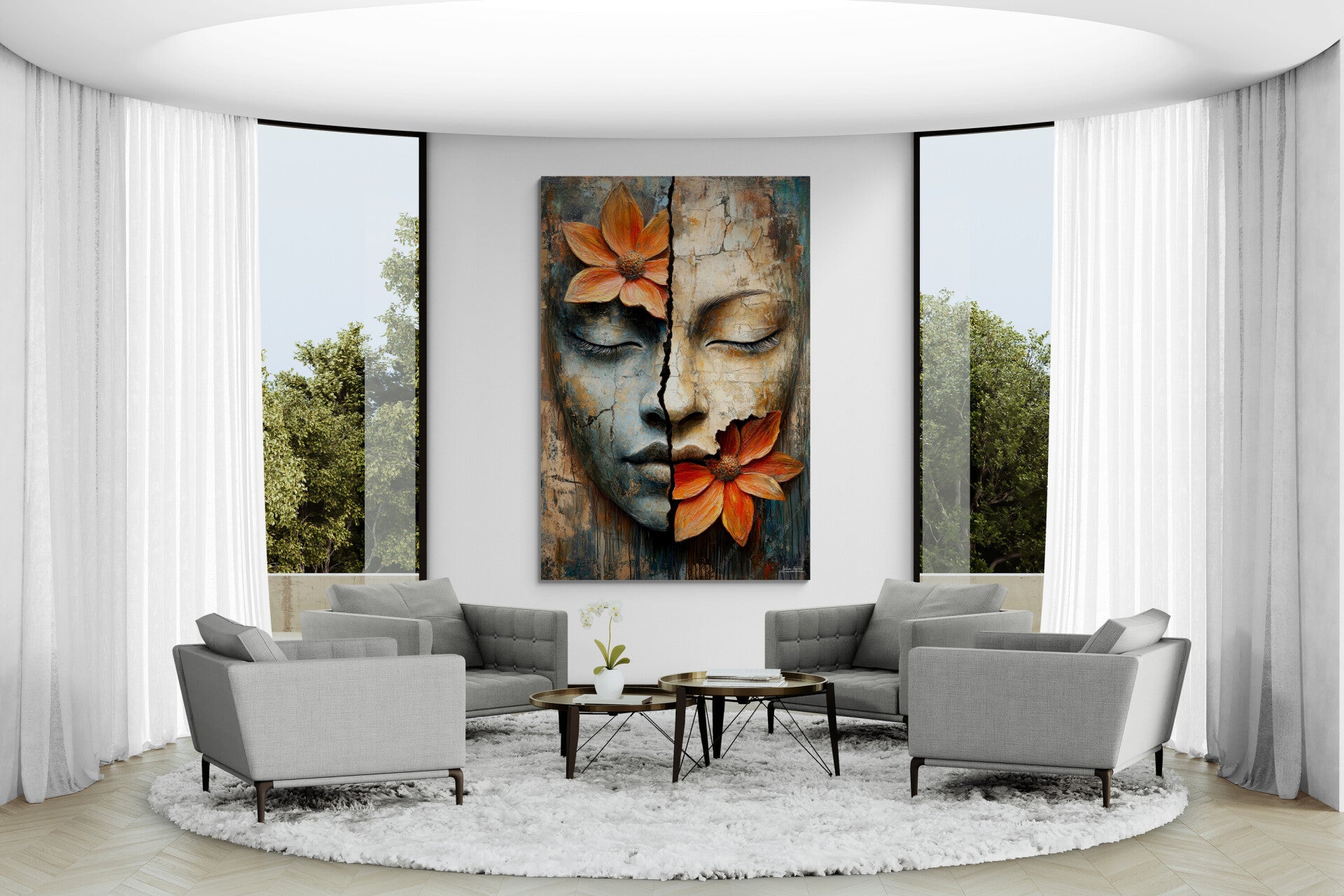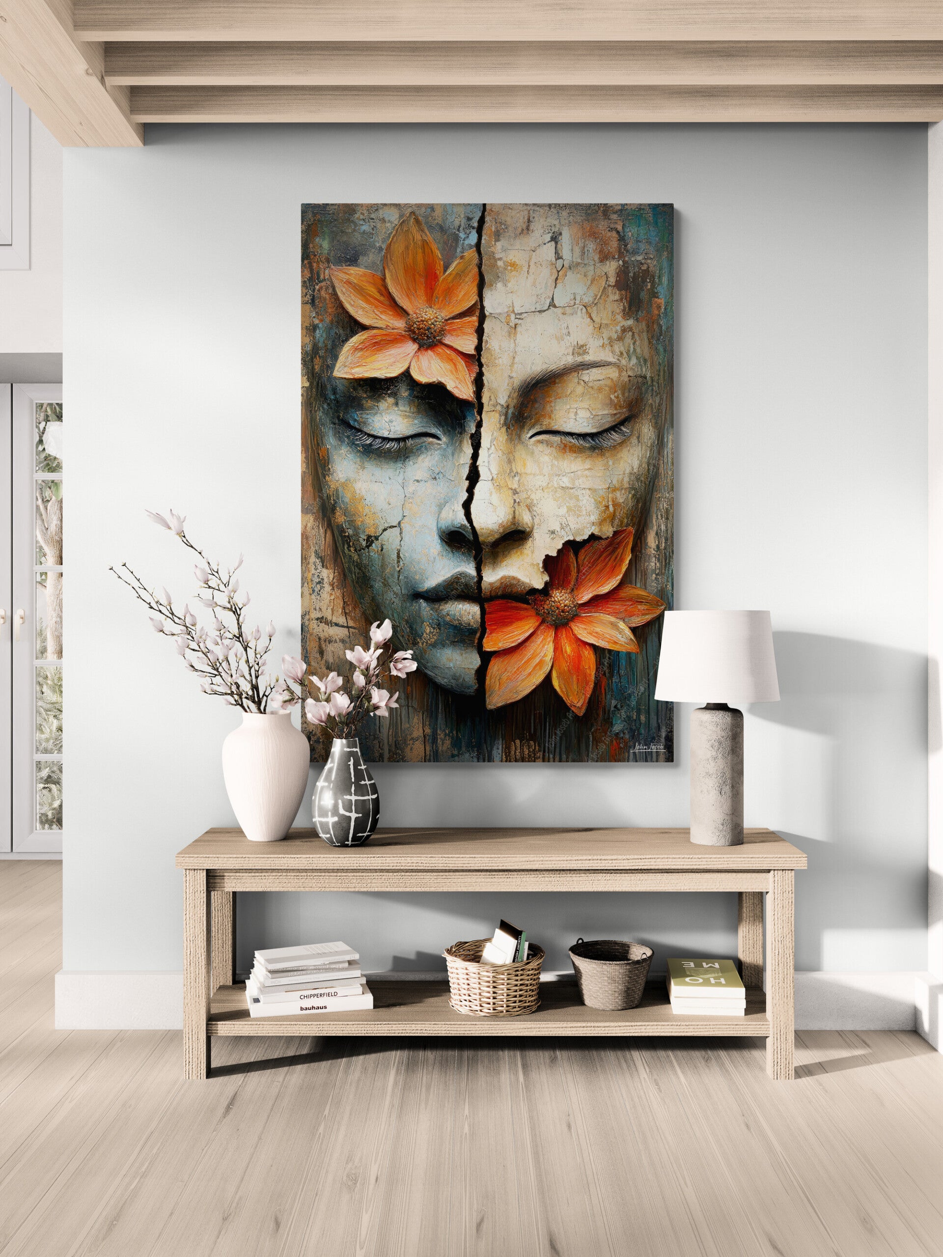Vrouw, gezicht met bloemen, gebroken, gecraqueleerd, abstract, grunge stijl, portret, kunst | mens, rood, goud, blauw, modern