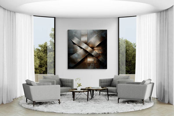Geometrisch abstract, industrieel, metaal, aluminium, staal, kunst | vierkant, zwart, bruin, koper, grijs, zilver, modern