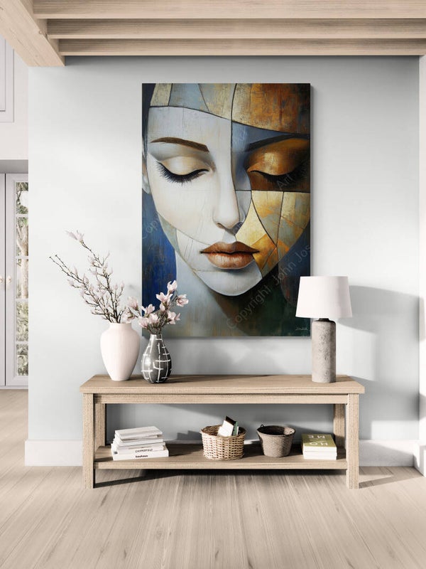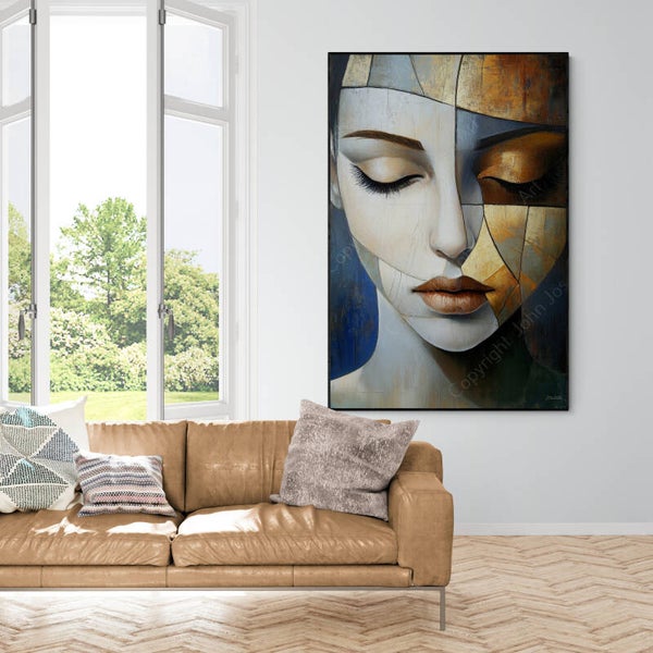 Vrouw gezicht, Picasso stijl, abstract, kubisme, kleurrijk, kunst | goud, rood, bruin, goud, blauw, mens, modern