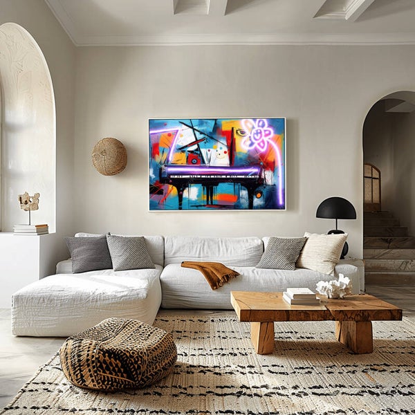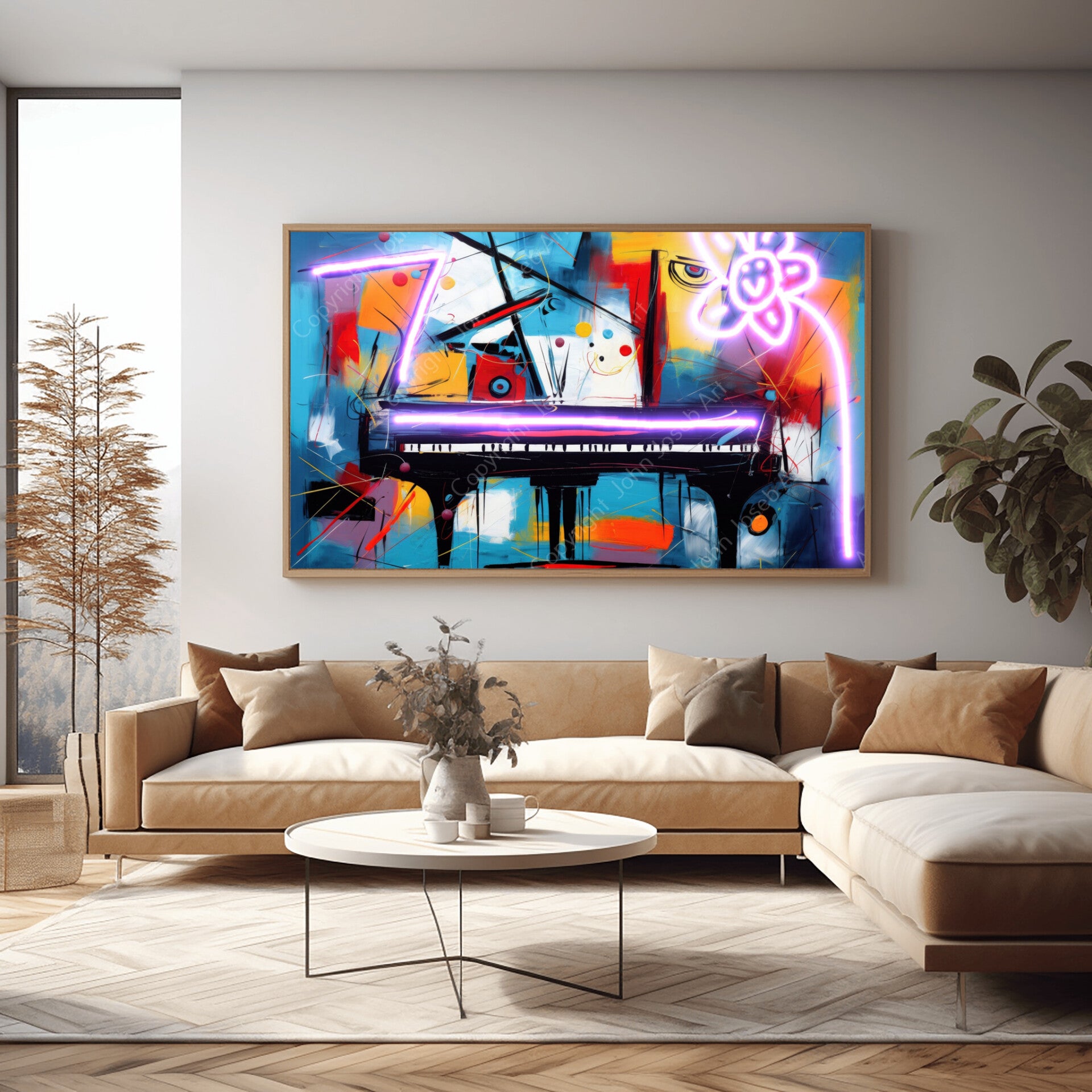 Piano, Herman Brood stijl, abstract, kleurrijk, neon, kunst | rood, geel, blauw, muziek, muziekinstrument, modern