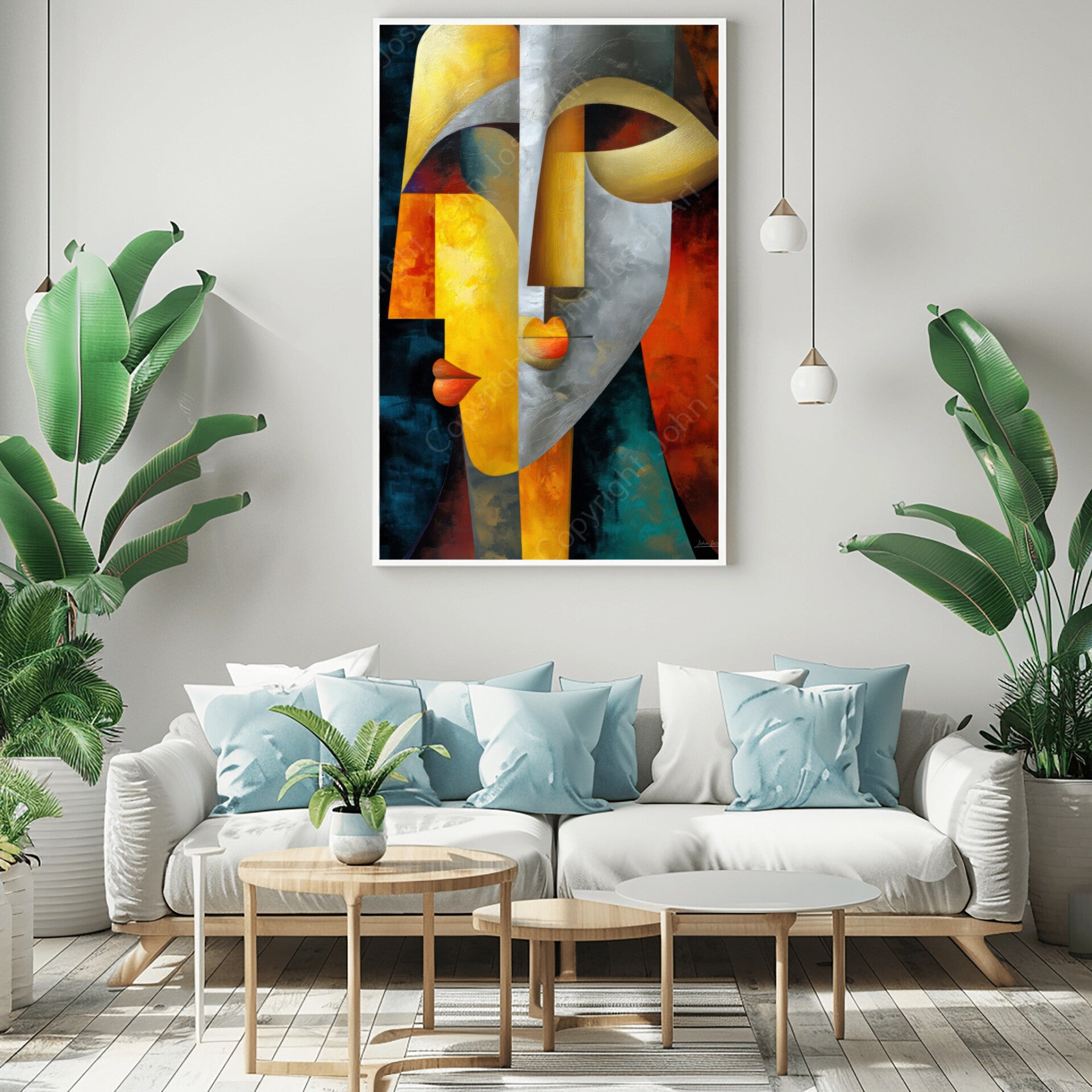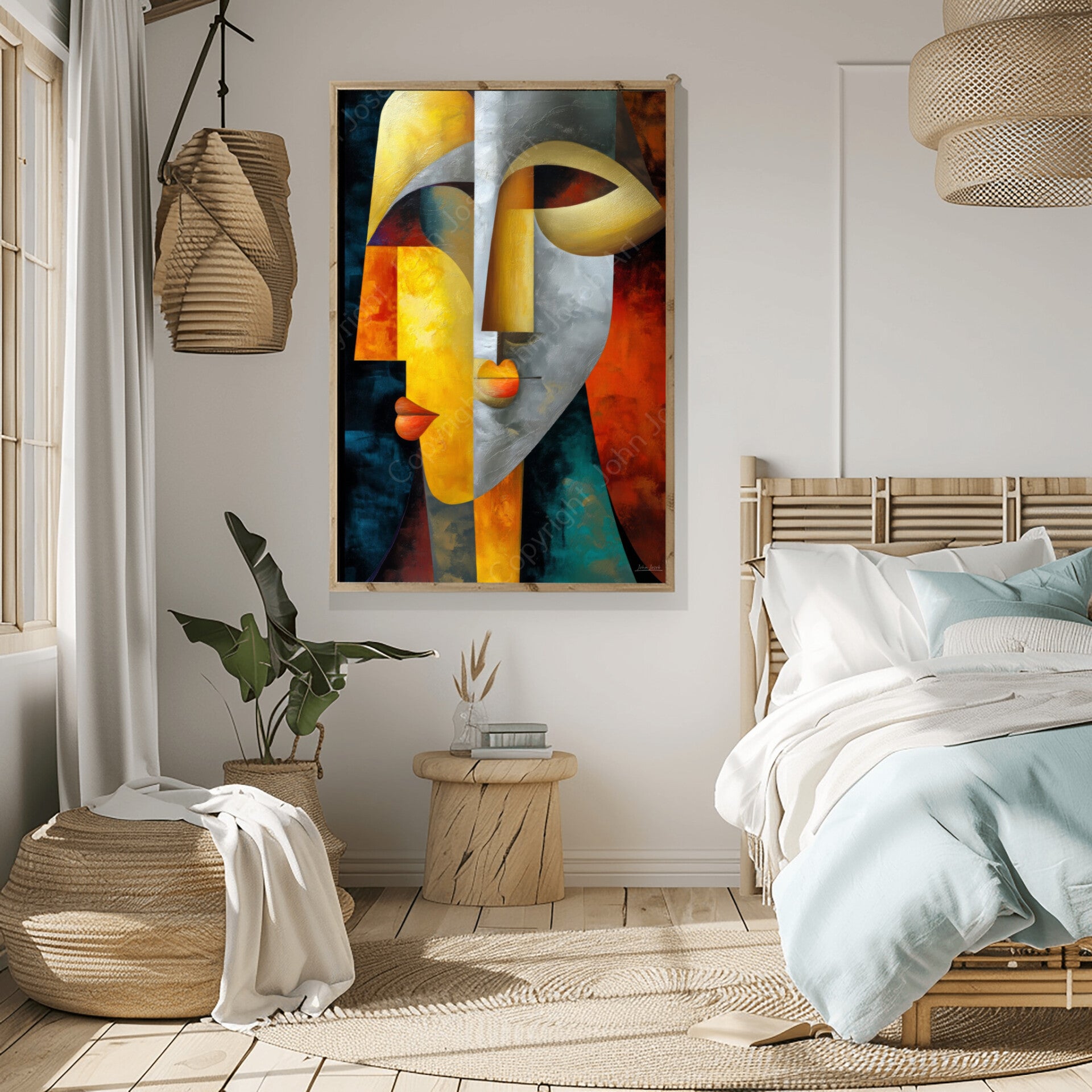Gezichten, Picasso stijl, kubisme, kleurrijk, abstract, kunst | mens, man, vrouw, goud, grijs, blauw, bruin, dier, modern