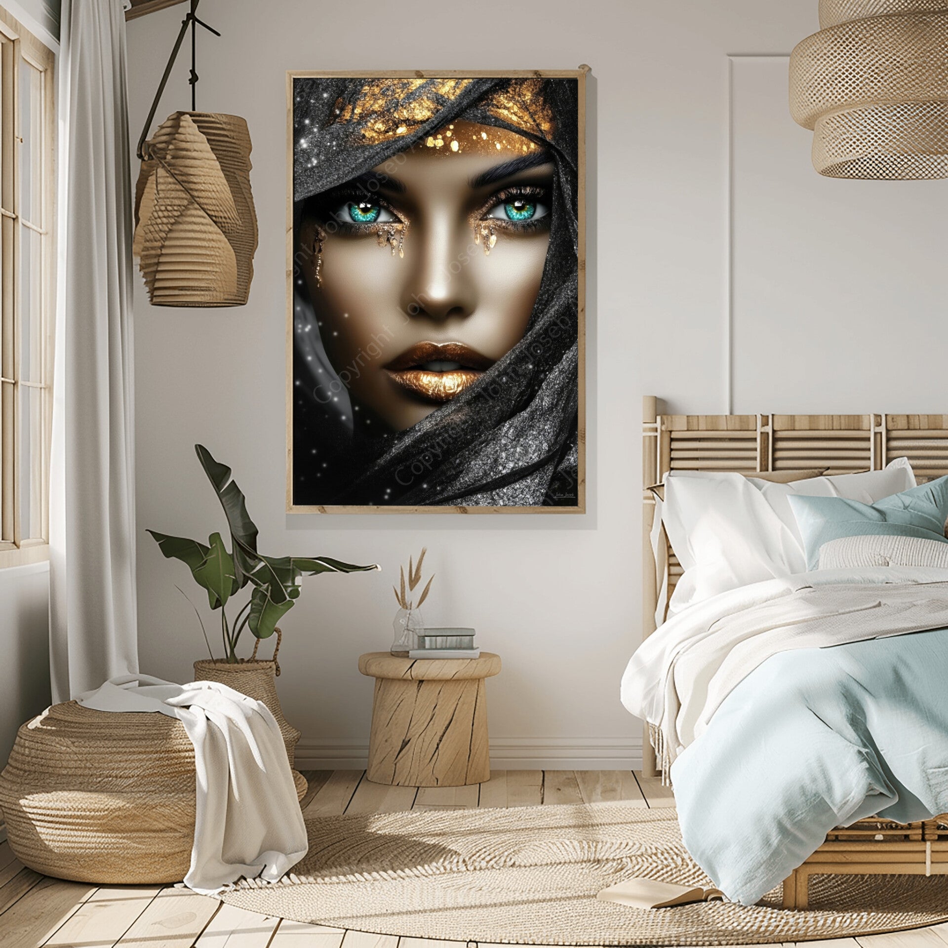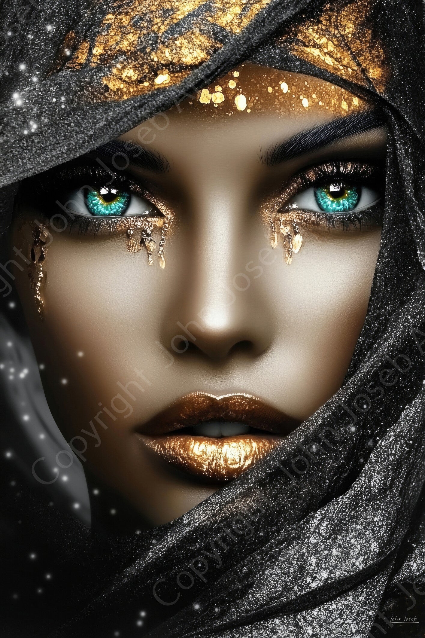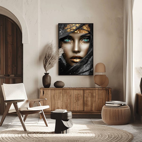 Vrouw met zwarte sluier en juwelen, sieraden, goud, kunst, bruin, blauw, zwart, modern