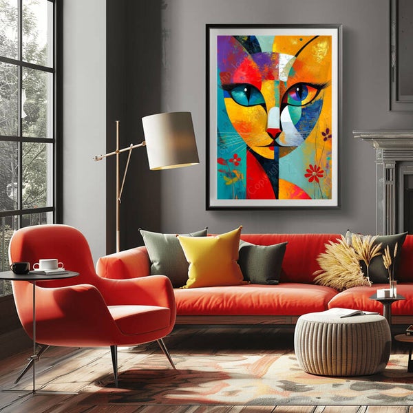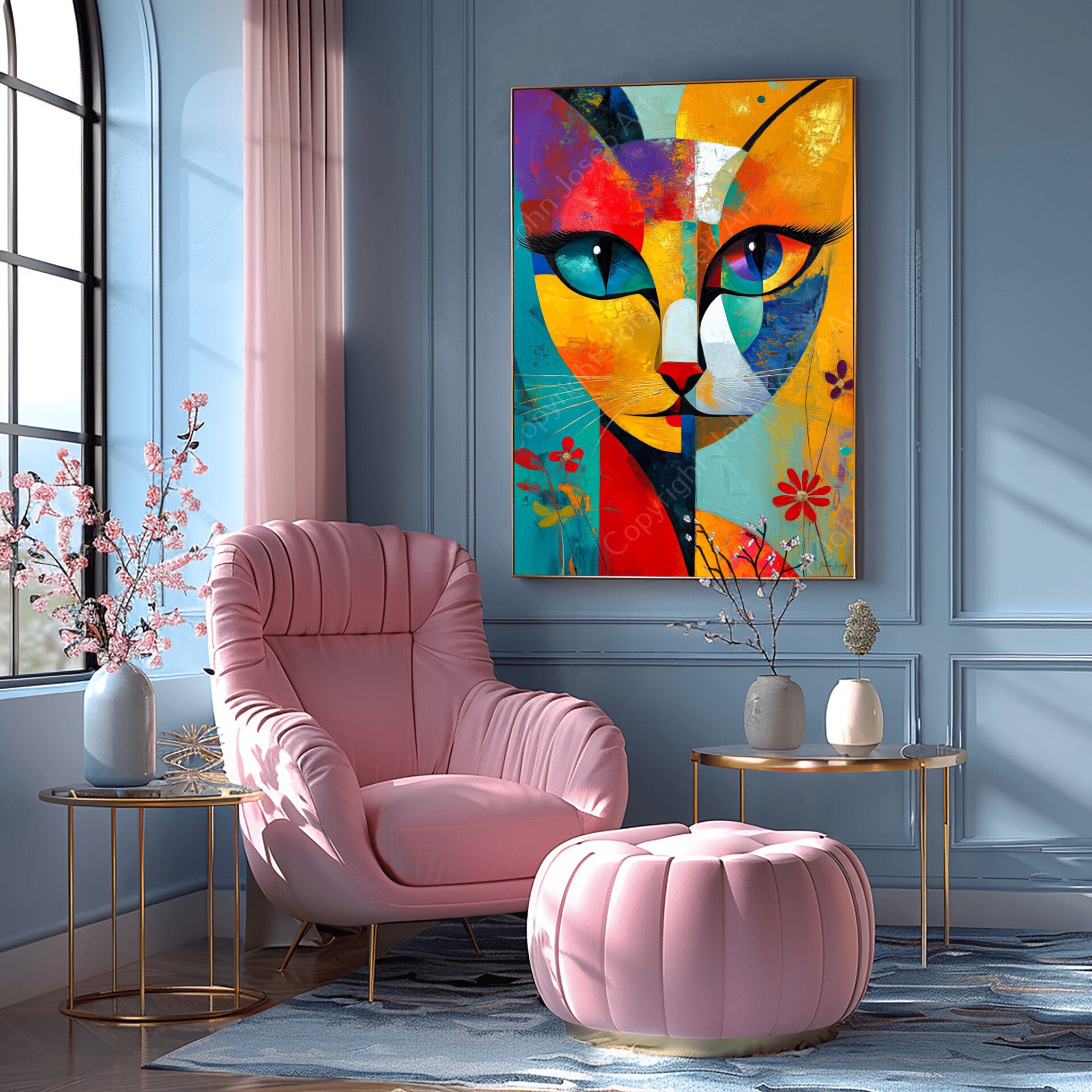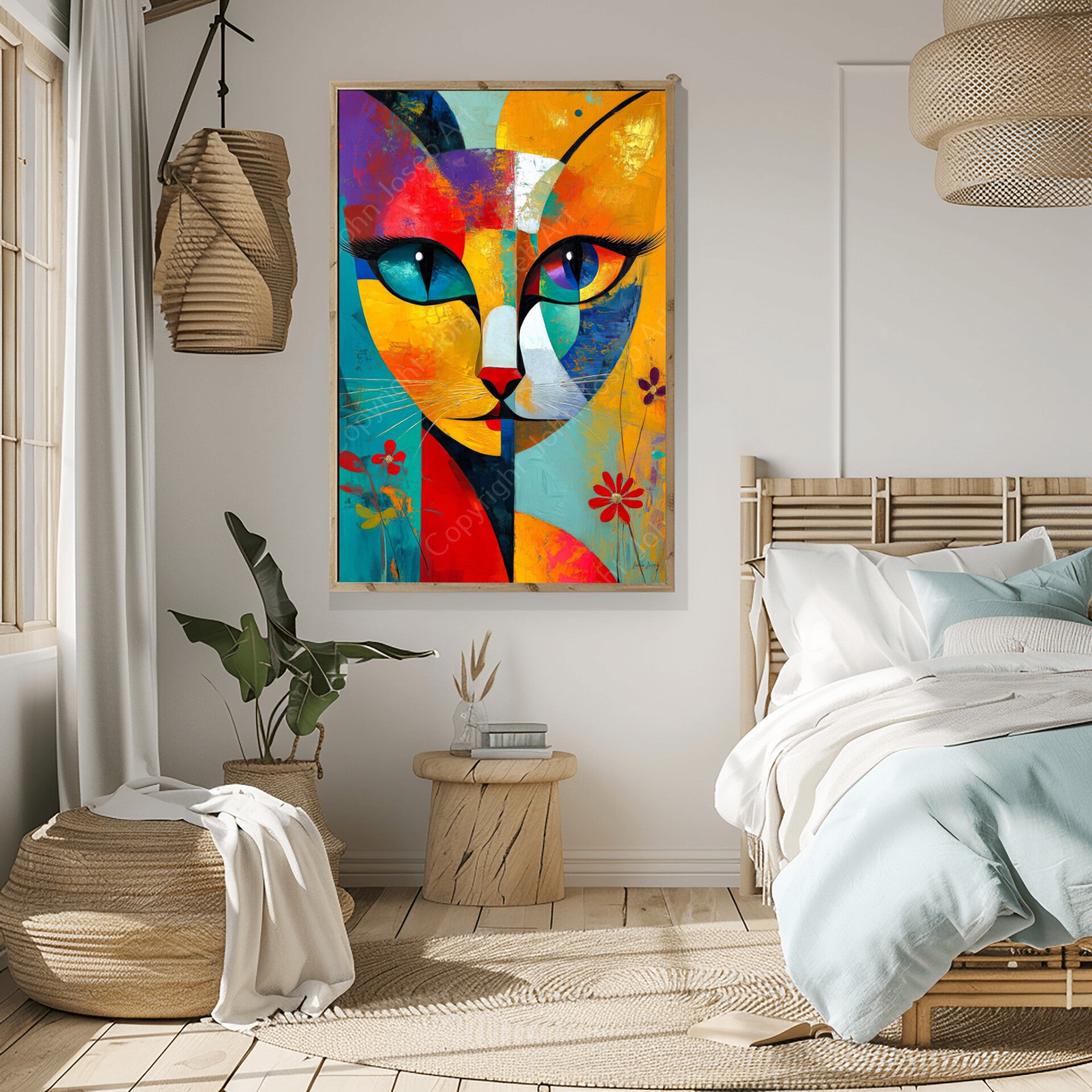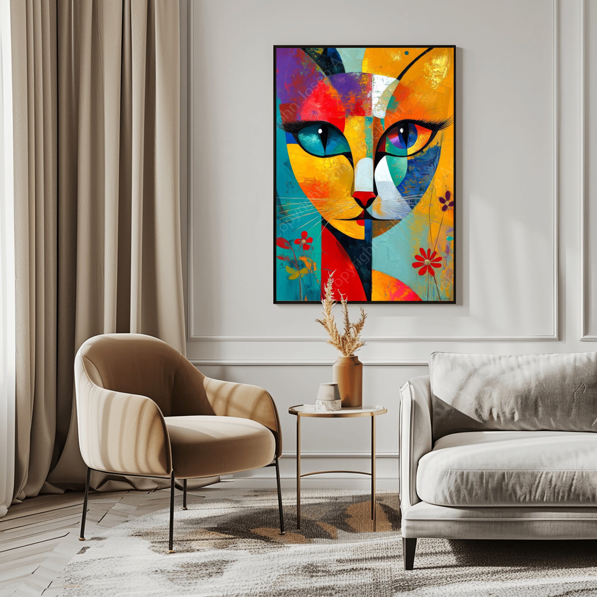 Poes / kat, kleurrijk, abstract, Picasso stijl, kunst, dier, poezen, blauw, bruin, geel, rood, modern