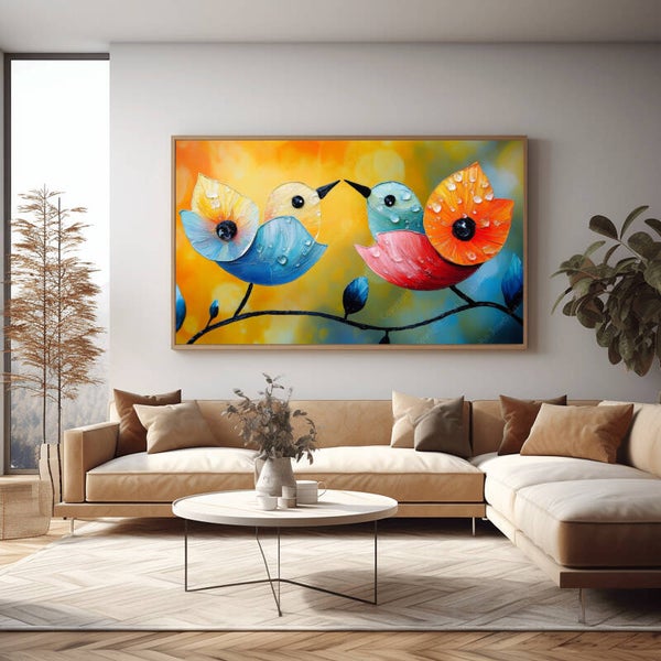 Bloemen als vogels, waterdruppels, abstract, surrealisme, kleurrijk, kunst | rood, geel, blauw, oranje, dier, modern
