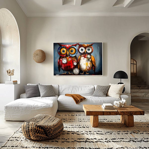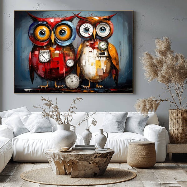 Grappige uilen met klokken, vogels, humor, abstract, kleurrijk, kunst, dier, vogel, uil, klok, rood, blauw, bruin, wit, modern