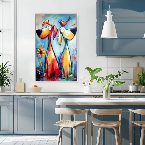 Honden kijken naar vogel, kleurrijk, abstract, kunst, dier, hond, geel, blauw, rood, modern
