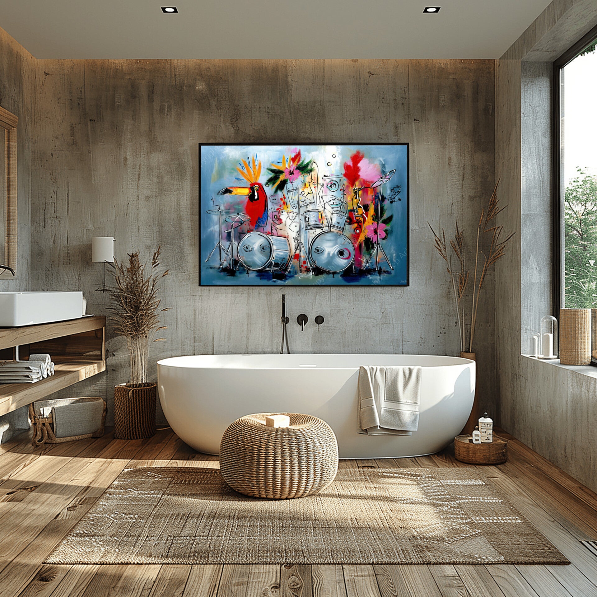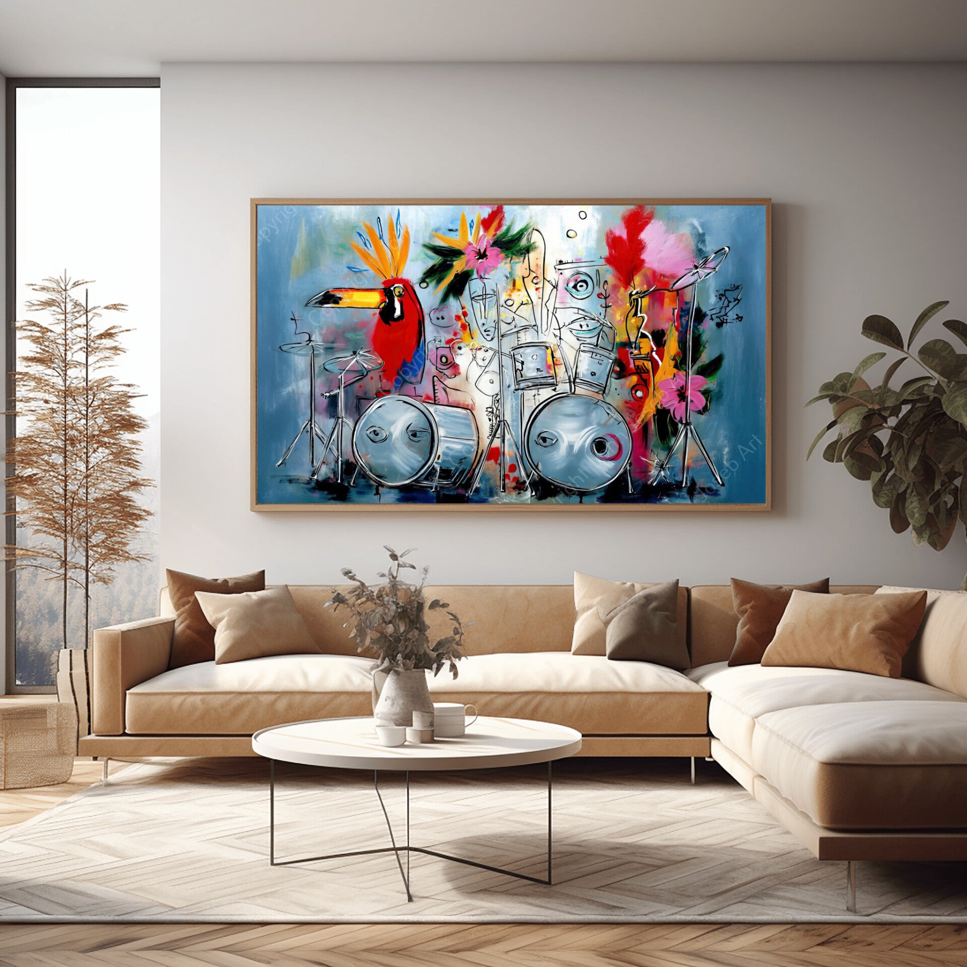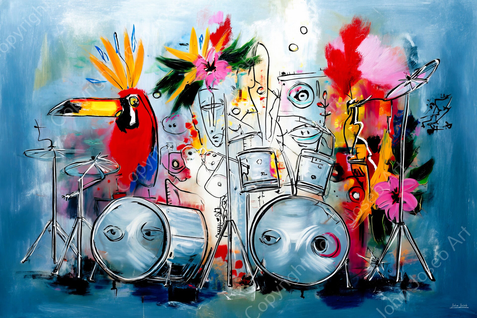 Drumstel, drummer, abstract, Herman Brood stijl, vogel, bloemen, kunst | muziek, muziekinstrument, rood, geel, blauw, modern