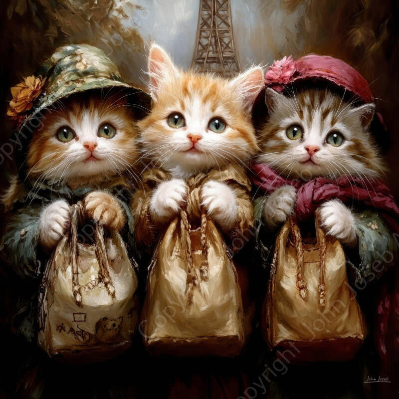 Schattige lieve kittens, poezen, shoppen in Parijs, grappig, Eiffeltoren, tassen, kleding, poes, kat, dier, kleurrijk, kunst, goud, rood, blauw, modern