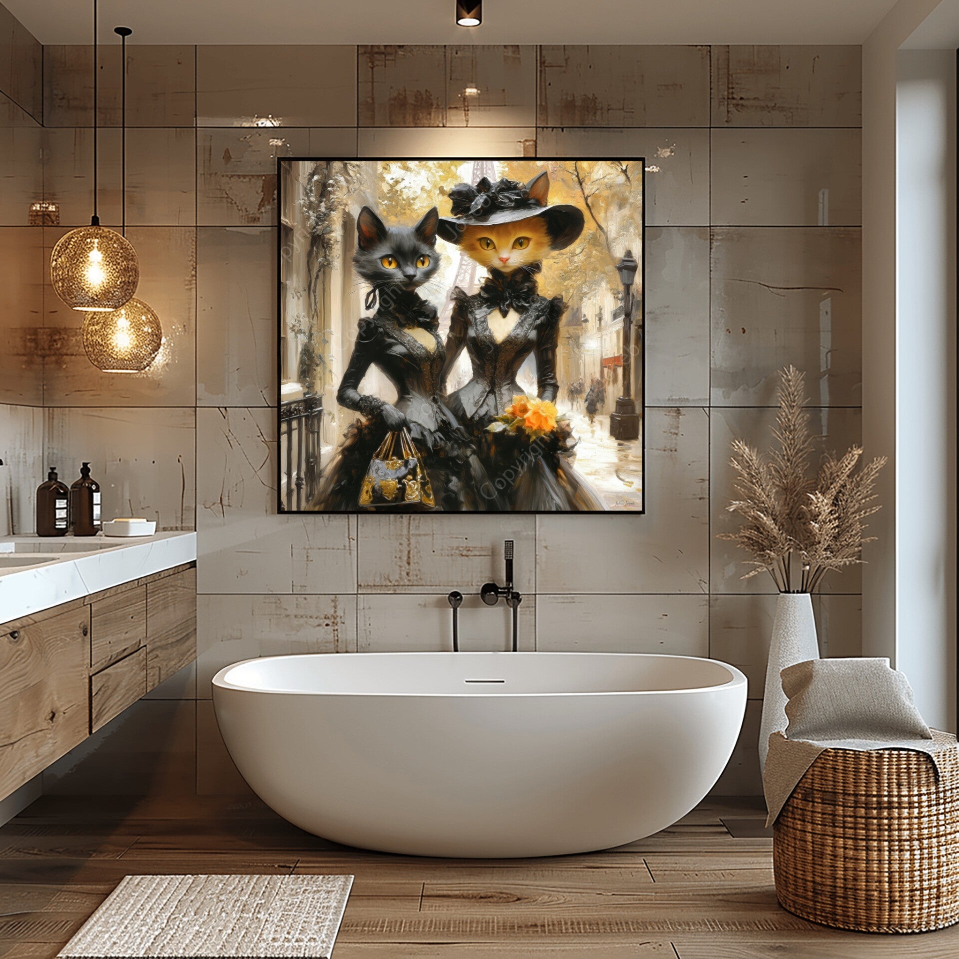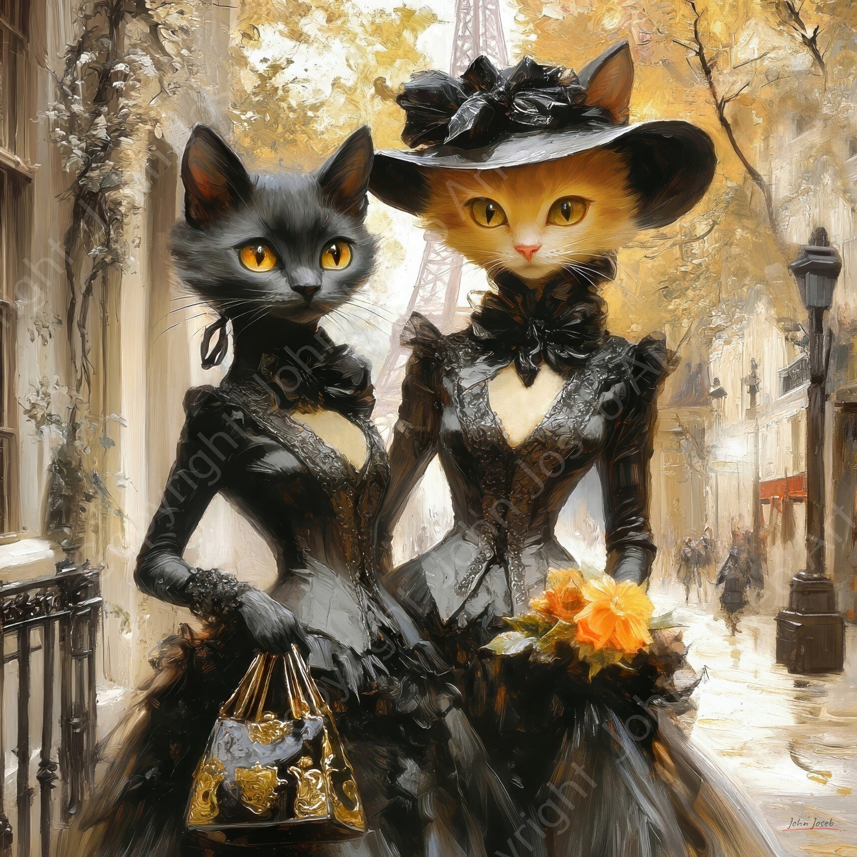 Poezen / vrouwen in mooie jurken shoppen in Parijs, Eiffeltoren, abstract, kunst, poes, kat, zwart, bruin, geel, vierkant, modern