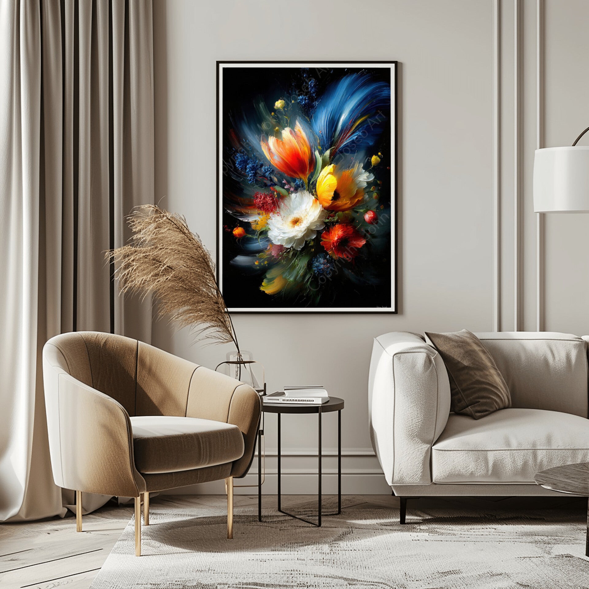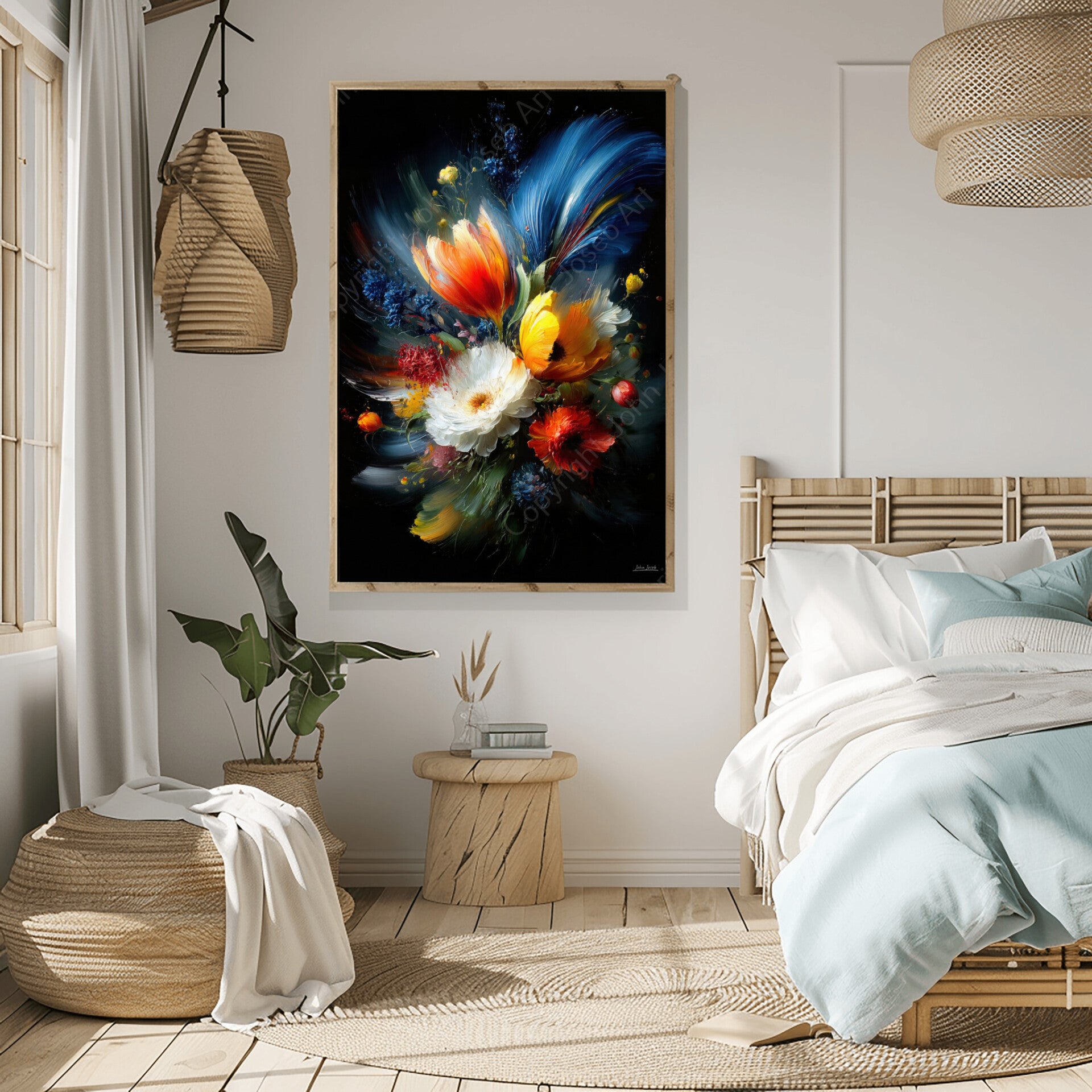 Bloemen, tulpen, kleurrijk, zwarte achtergrond, geschilderde stijl, stilleven, boeket, kunst, blauw, rood, geel, groen, modern