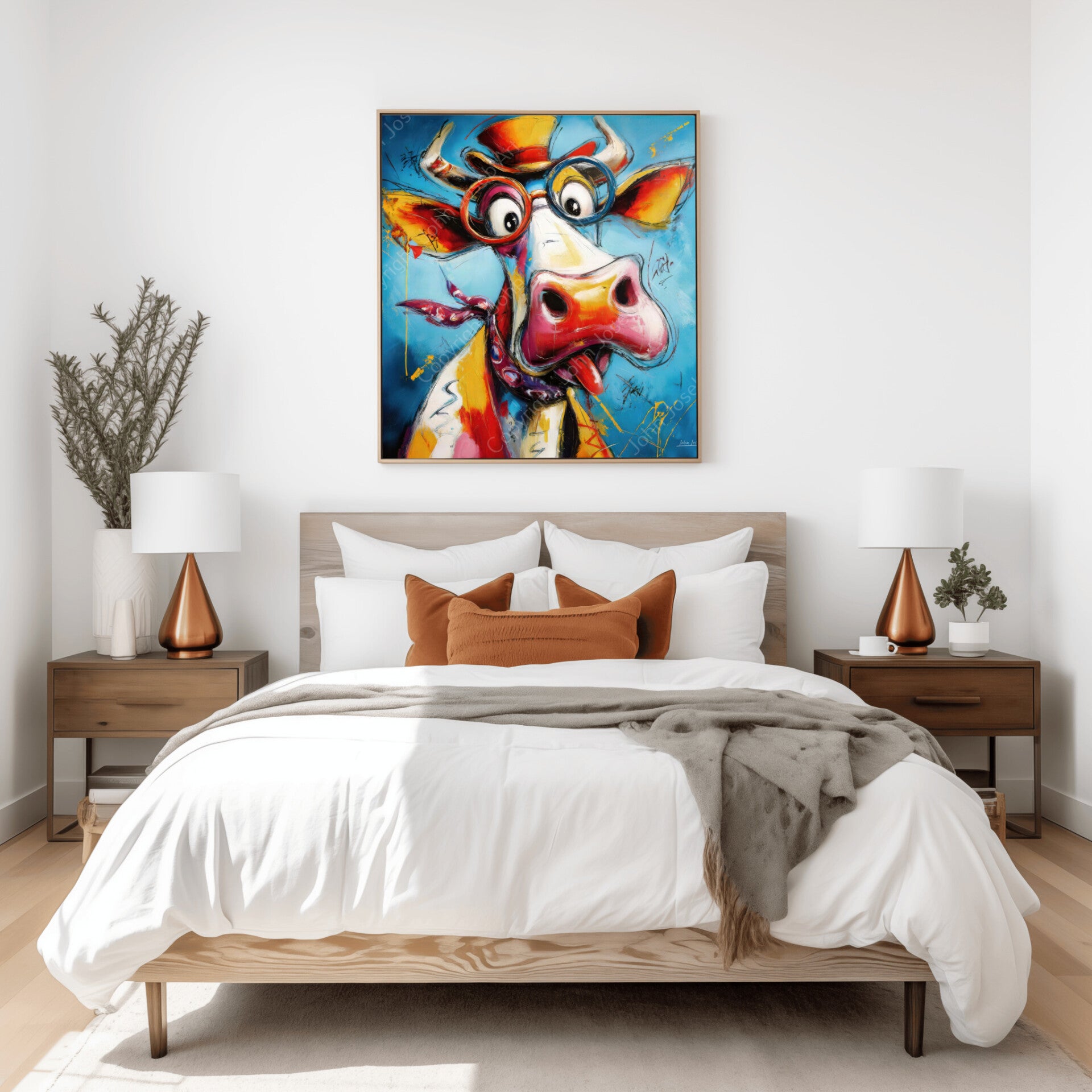 Grappige koe / stier met bril en hoed, humor, abstract, kleurrijk, kunst, vierkant, dier, rood, geel, blauw, wit, modern