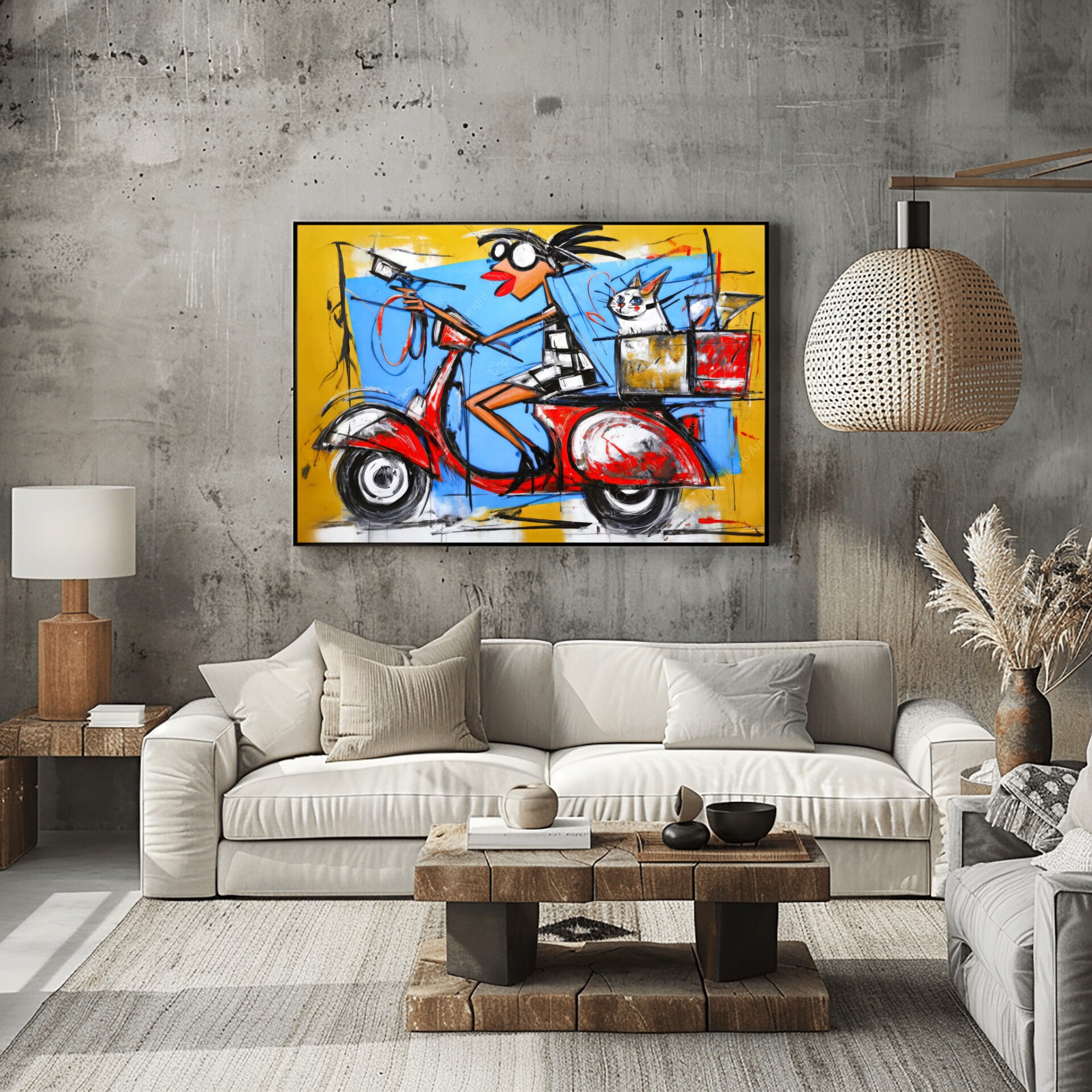Vrouw op scooter met poes / kat, abstract, Herman Brood stijl, gek, grappig, humor, dier, mens, kunst, bruin, rood, blauw, modern