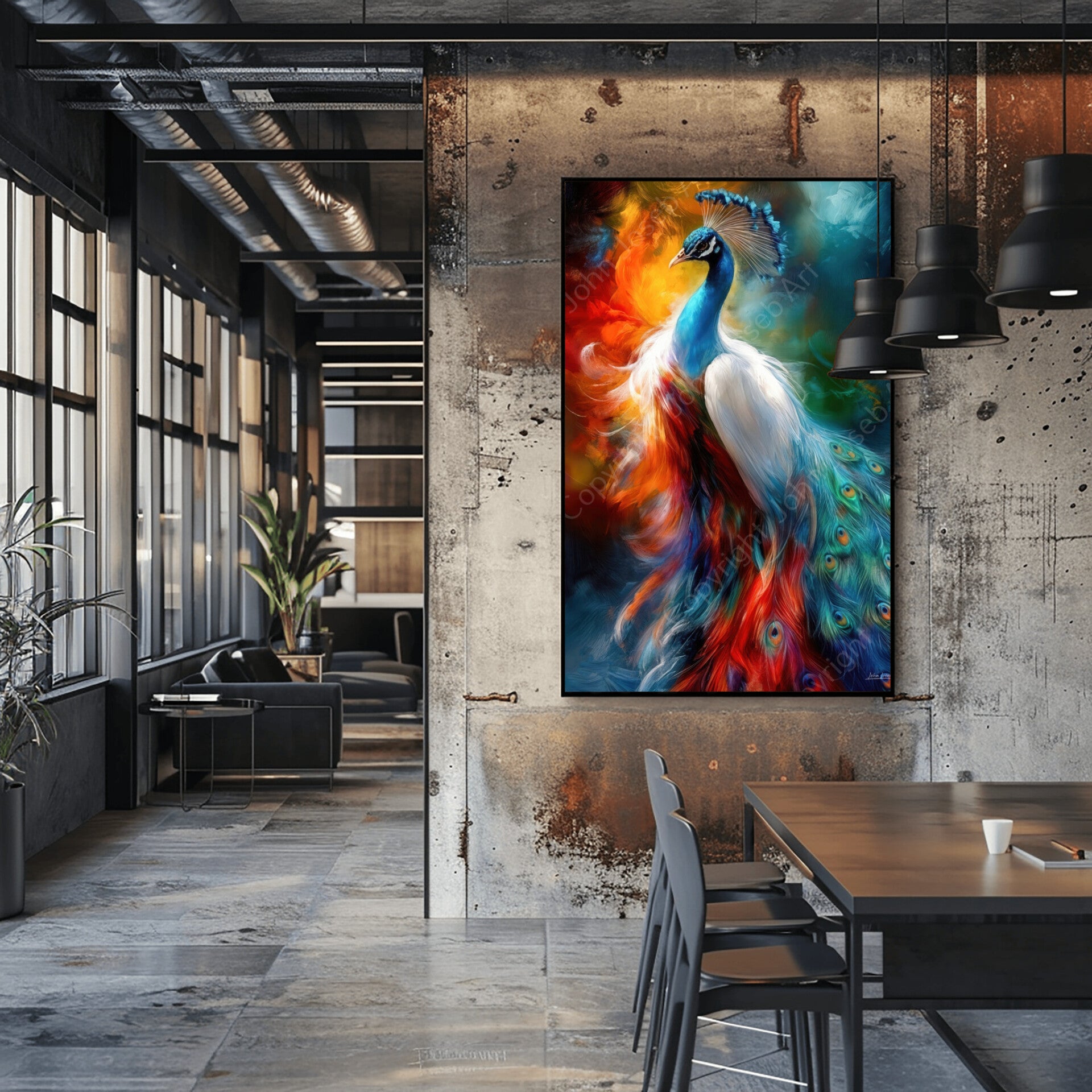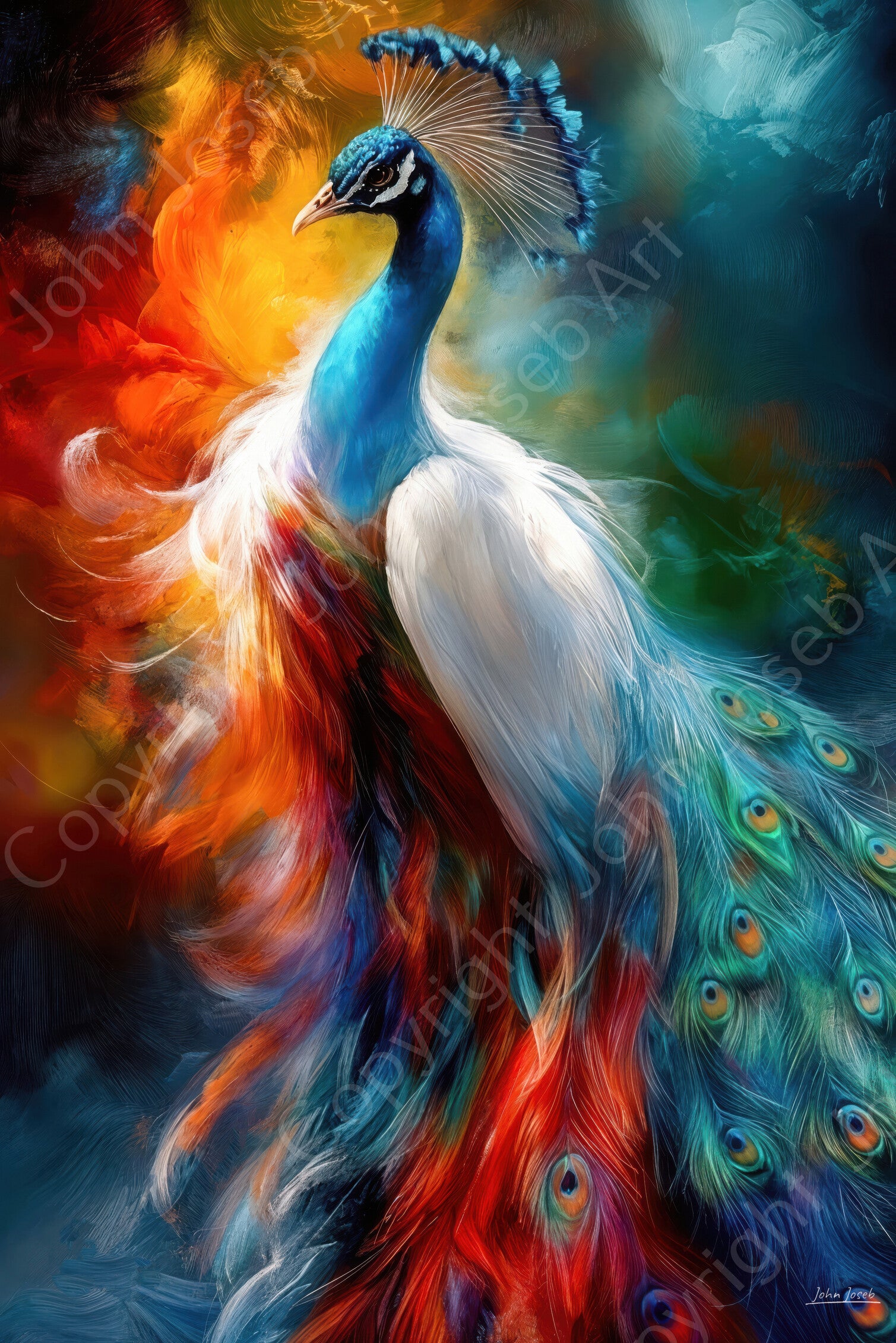 Mooie sierlijke pauw, abstract, artistiek, kleurrijk, felle kleuren, kunst, blauw, rood, geel, wit, groen, modern