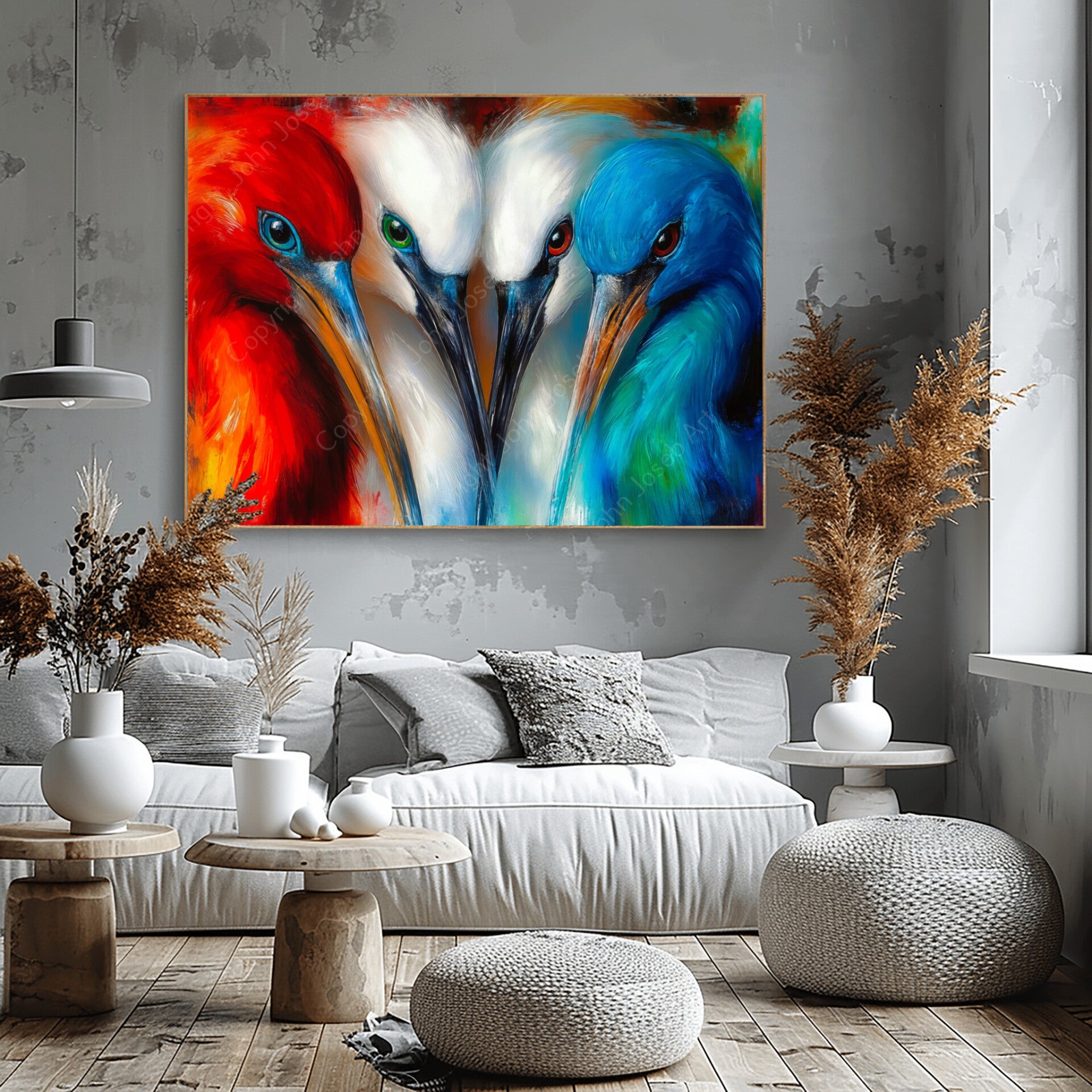 Vogels met lange snavel, artistiek, abstract, kleurrijk, felle kleuren, kunst | vogel, dier, rood, geel, blauw, wit, modern