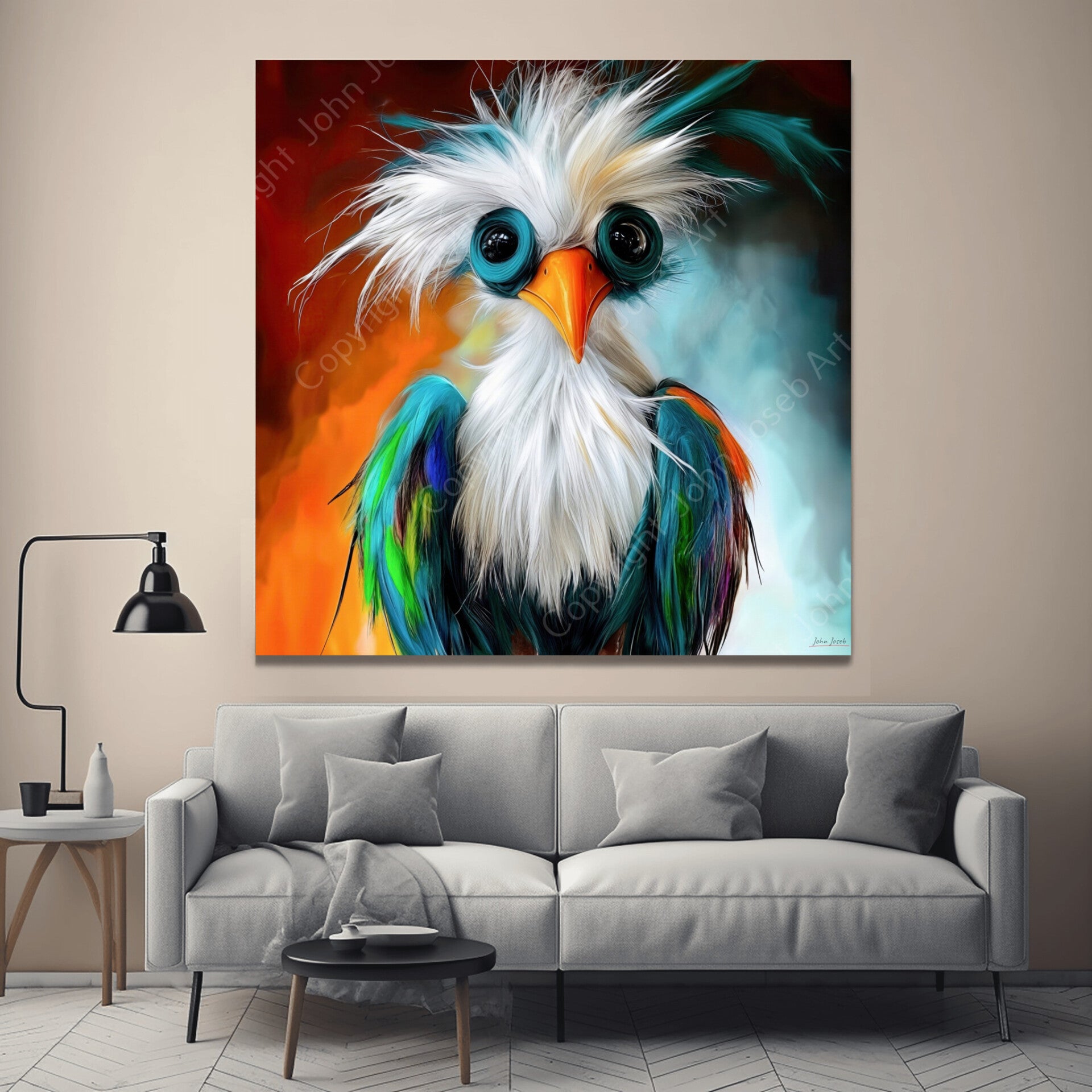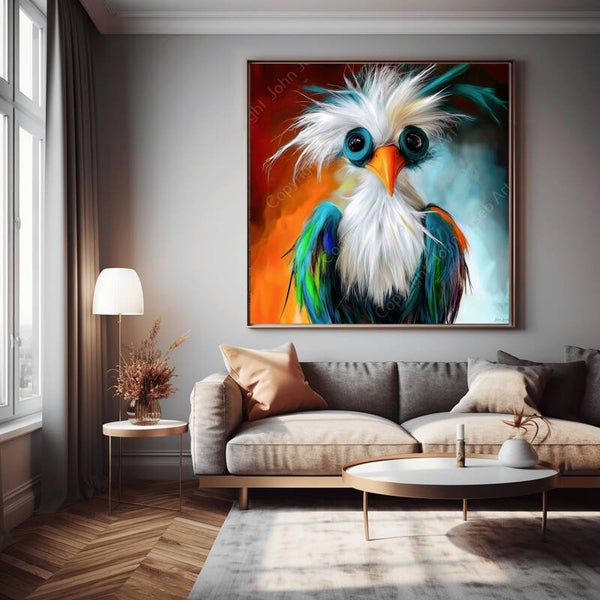 Gekke grappige vogel, humor, abstract, artistiek, kleurrijk, felle kleuren, dier, vierkant, kunst, blauw, rood, oranje, wit, groen, modern