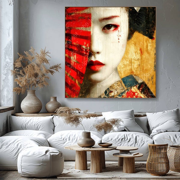 Geisha, Japan, gezicht, portret, abstract, artistiek, vrouw, kleurrijk, kunst, vierkant, goud, rood, wit, blauw, modern