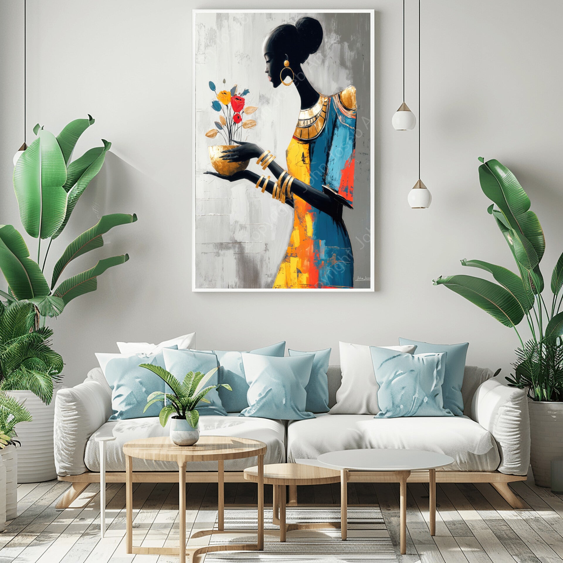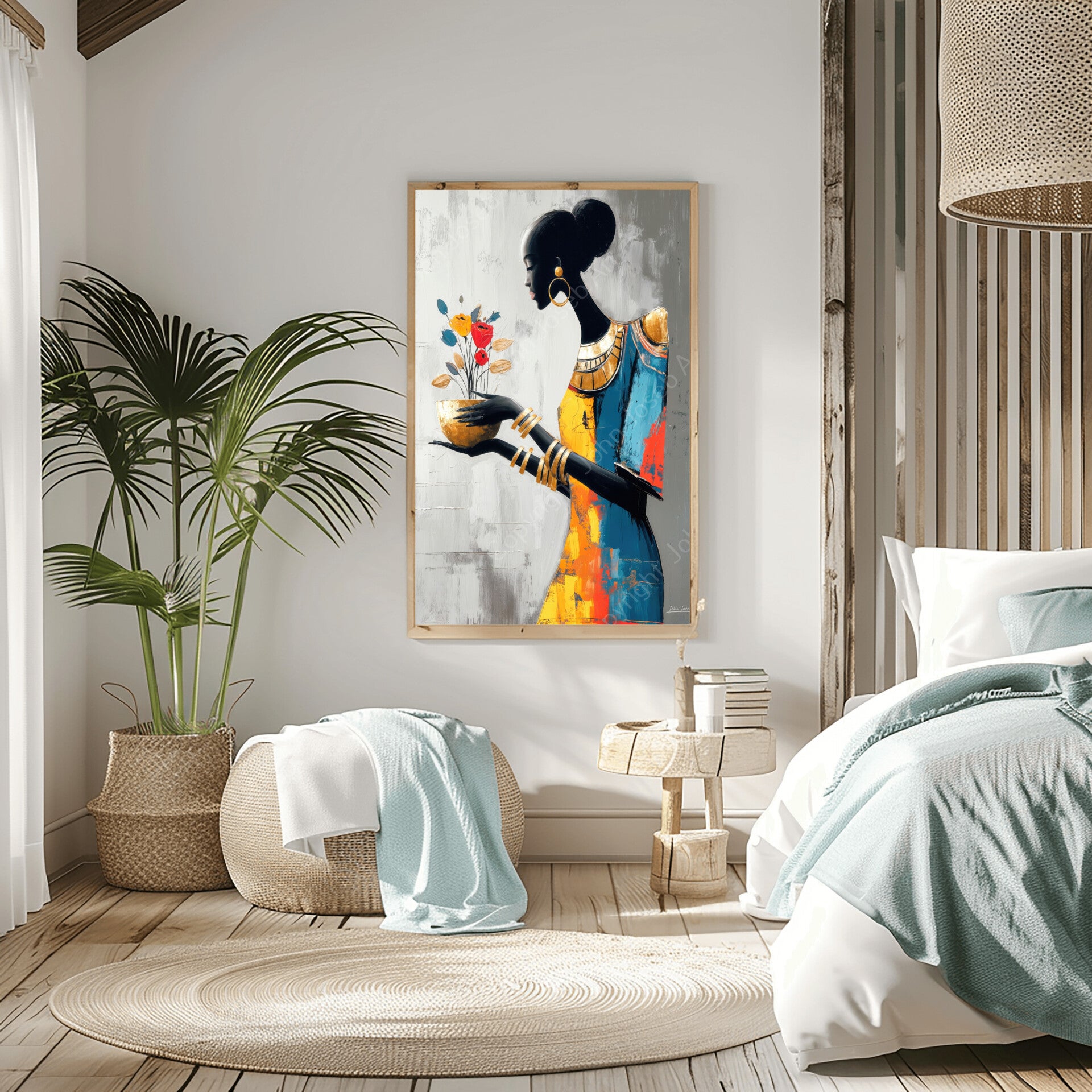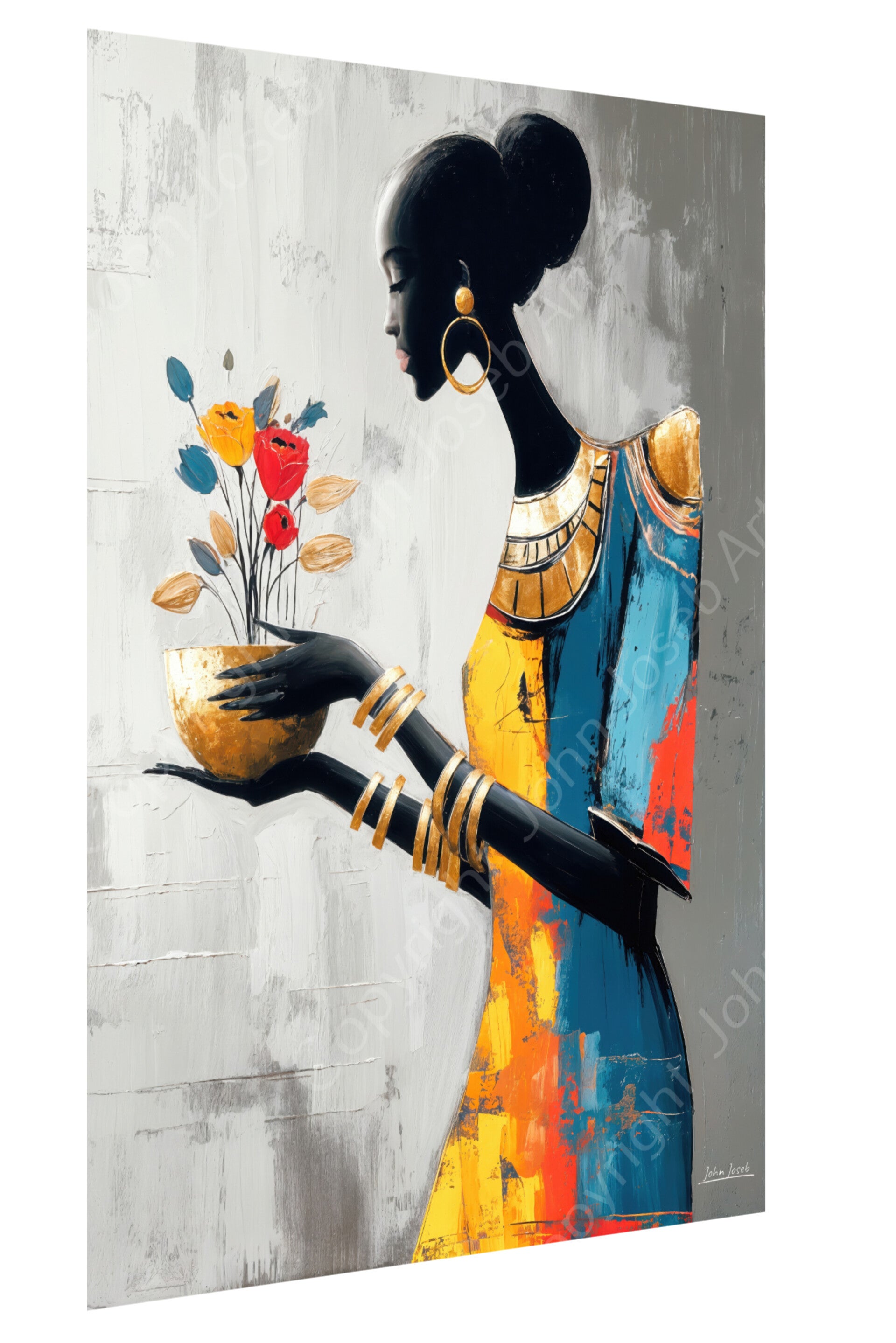 Donkere vrouw geeft bloemen, artistiek, abstract, juwelen, sieraden, kunst, goud, rood, geel, blauw, mens, modern