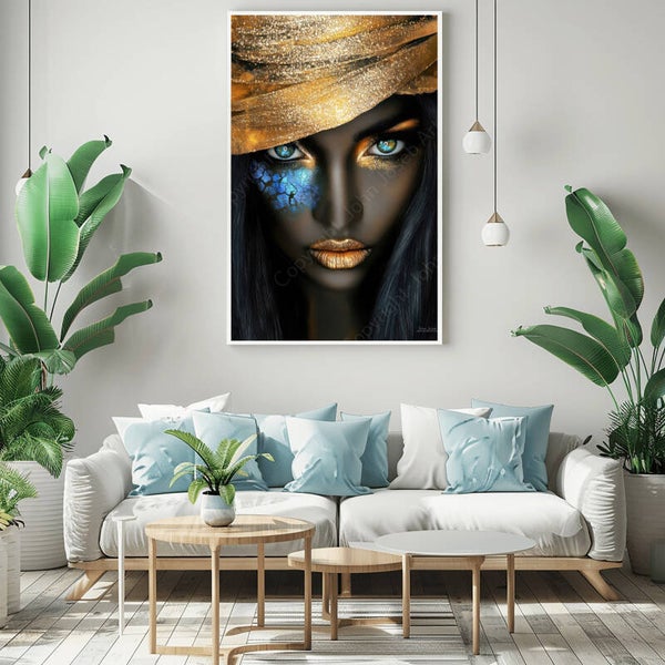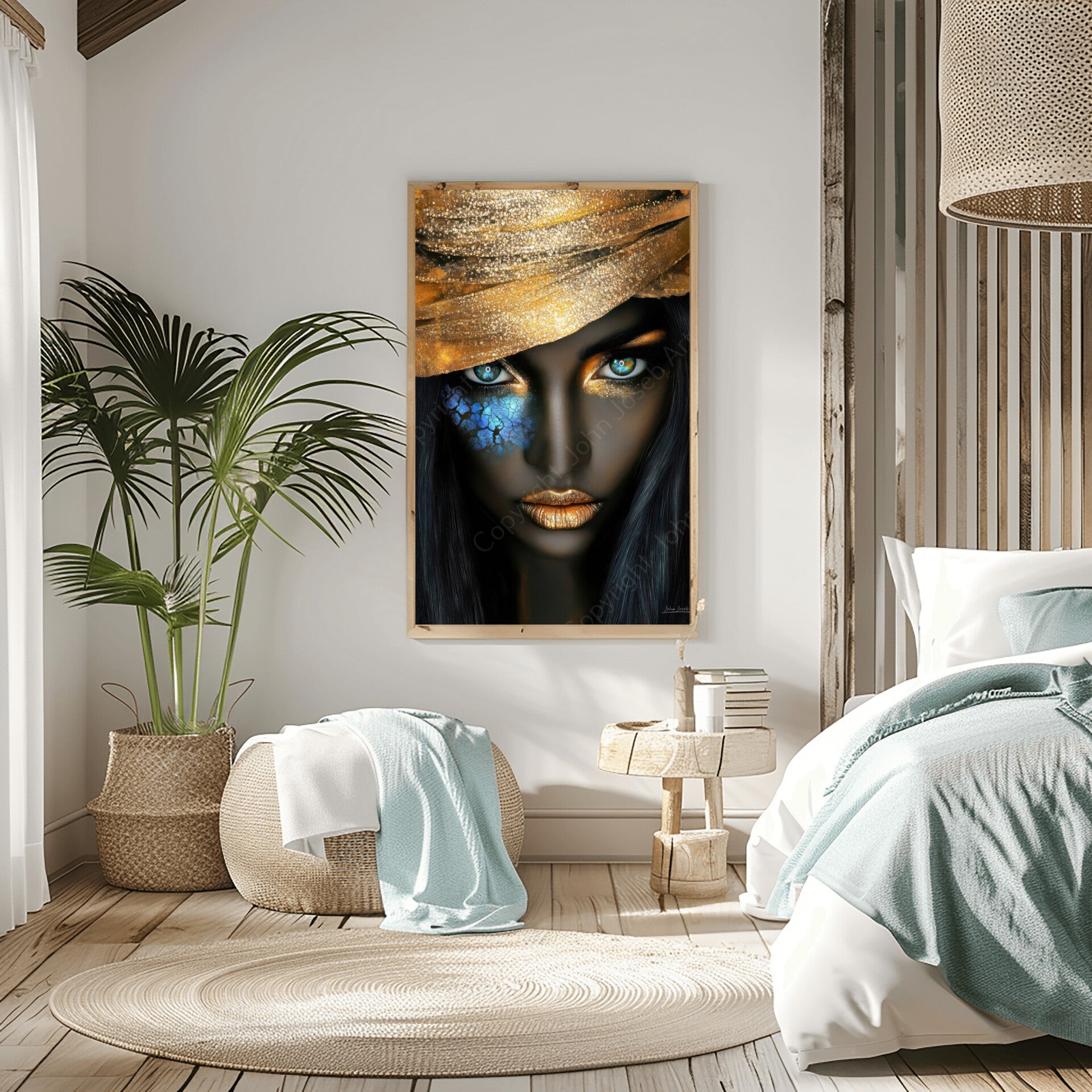 Donkere vrouw met blauwe ogen en gouden lippen, hoofddoek, abstract, artistiek, kleurrijk, felle kleuren, kunst, goud, blauw, zwart, bruin, modern