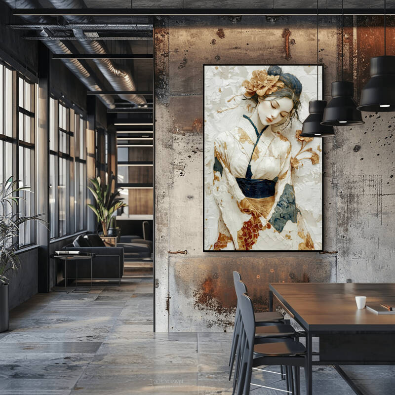 Geisha, Japan, abstract, artistiek, vrouw, kunst, goud, blauw, wit, grijs, modern