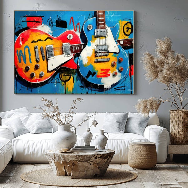 Gitaren, abstract, Gibson, Herman Brood stijl, kleurrijk, kunst, muziekinstrument, gitaar, muziek, rood, blauw, wit, geel, modern