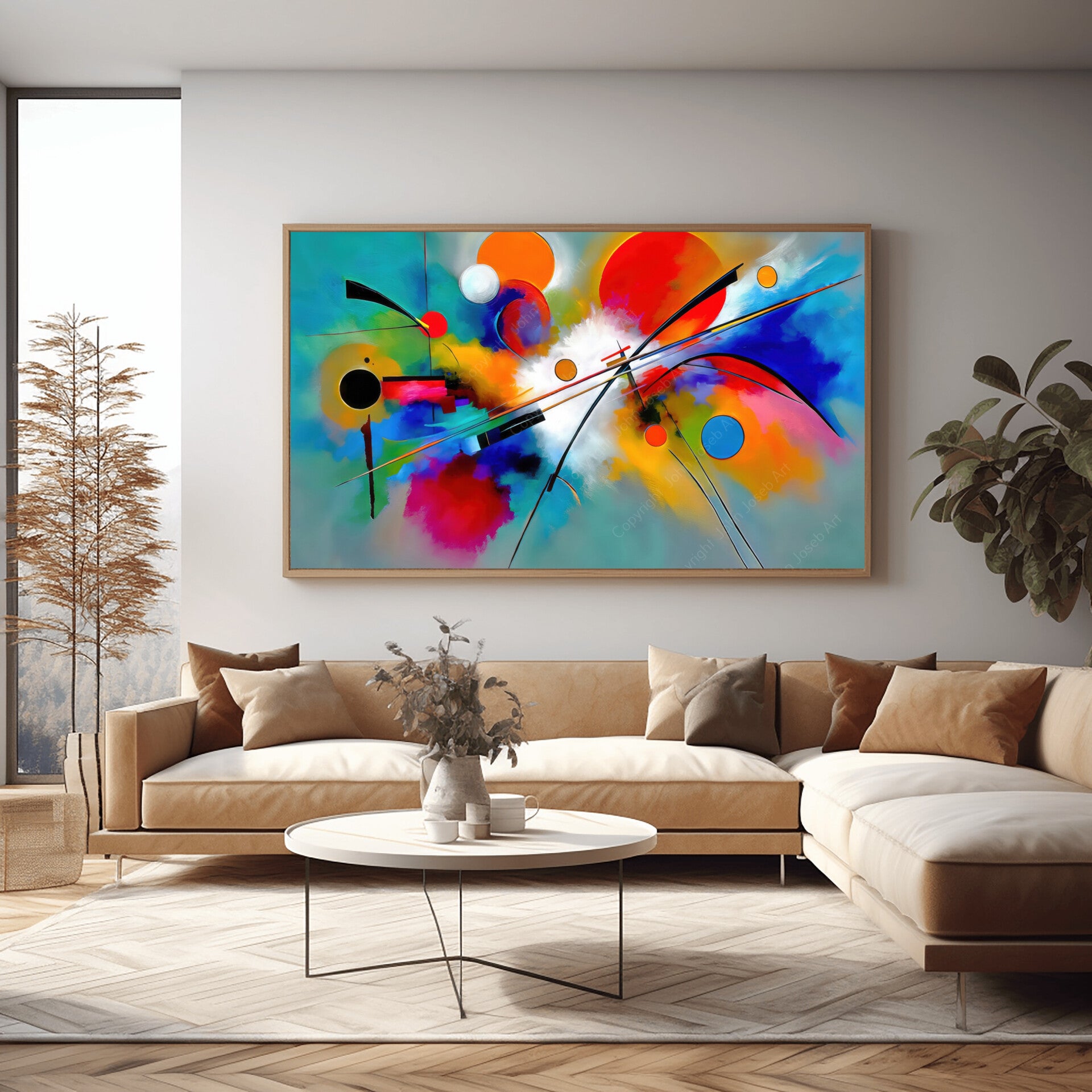 Kandinsky stijl, abstract geometrisch, cirkels, strepen, kleurrijk, kunst | rood, geel, blauw, oranje, wit, modern