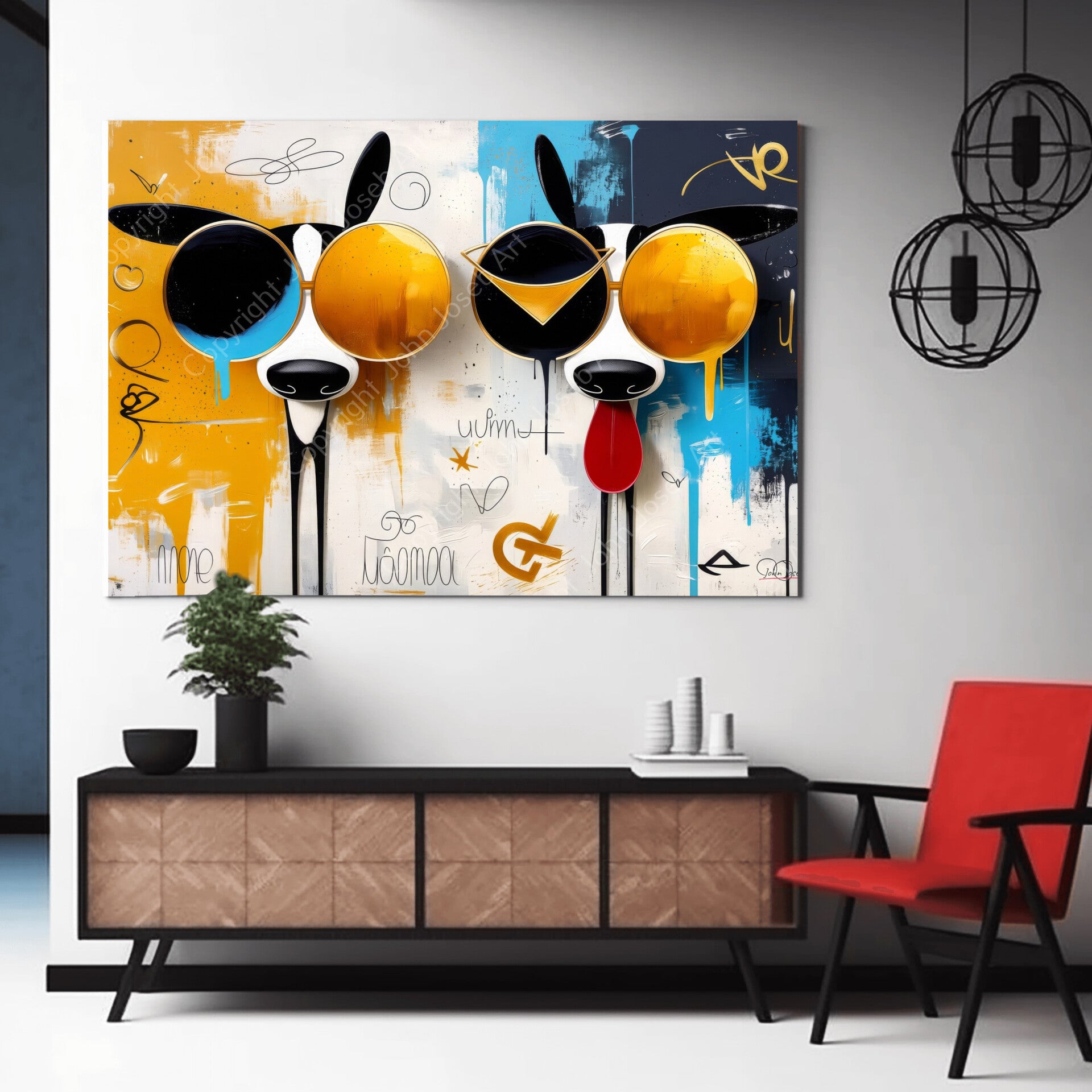 Gekke grappige honden met bril, humor, kleurrijk, abstract, graffiti, kunst, hond, goud, blauw, wit, rood, modern