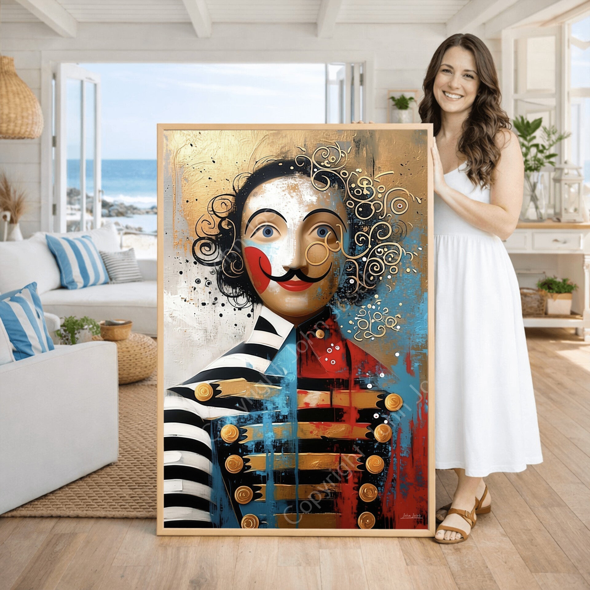Grappige man, pop van hout in kostuum, abstract surrealisme, artistiek, kunst, kleurrijk, mens, blauw, goud, rood, bruin, modern