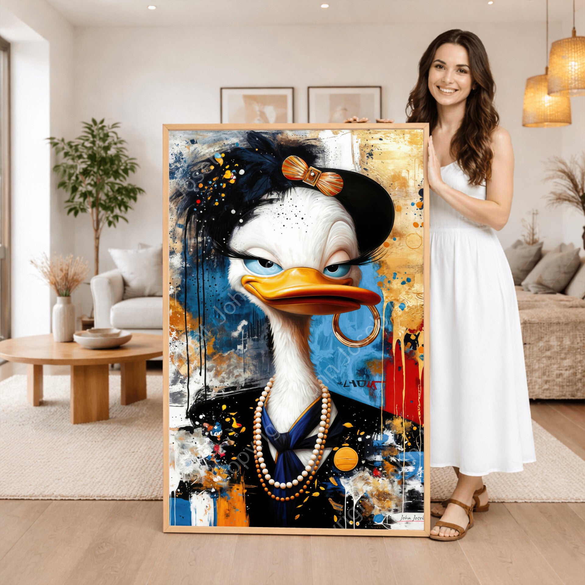 Koningin eend in kostuum, abstract surrealisme, portret, grappig, humor, juwelen, sieraden, kunst, kleurrijk, dier, vogel, blauw, goud, rood, bruin, modern