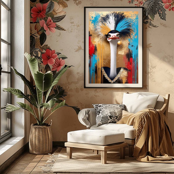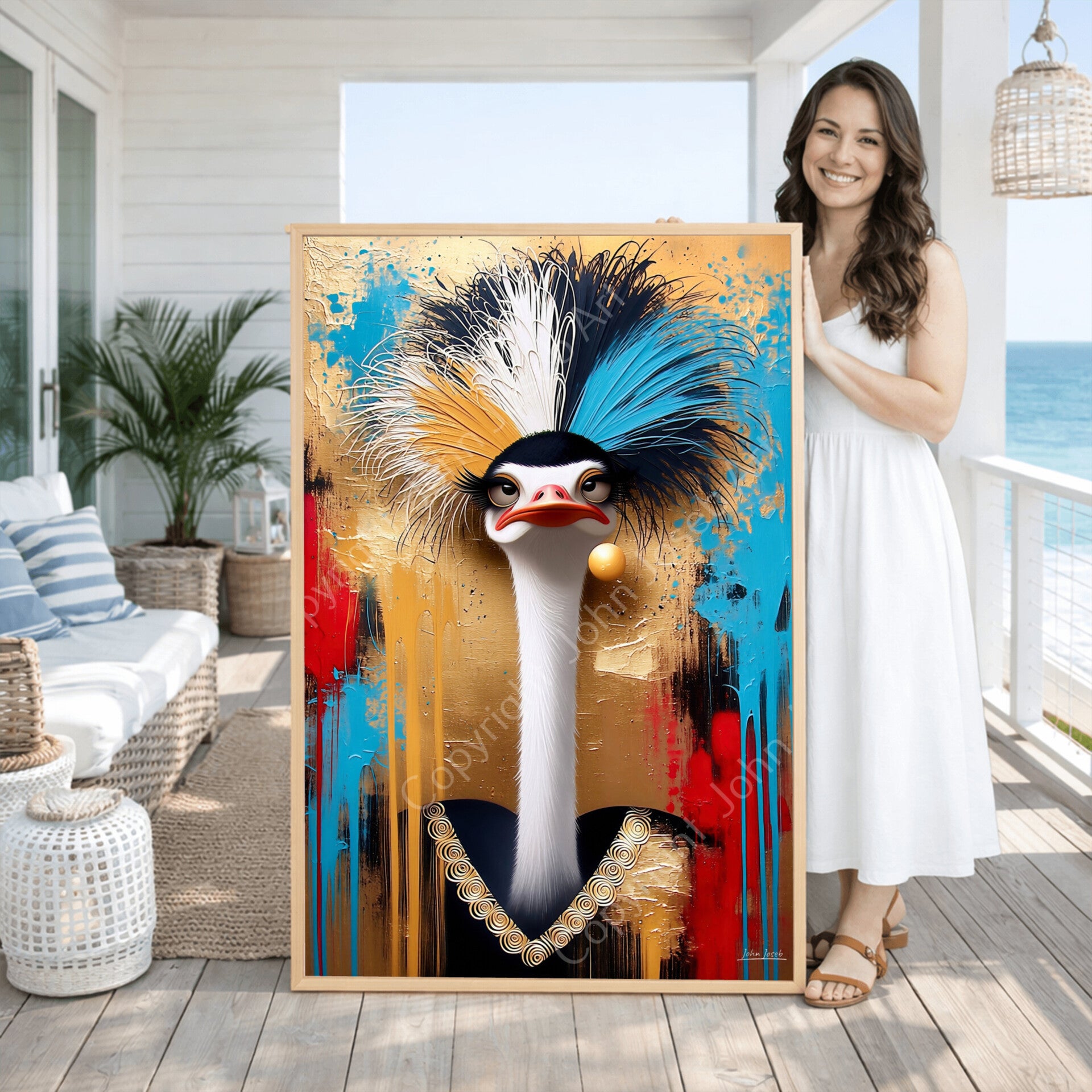 Gekke grappige hertogin struisvogel in jurk, abstract surrealisme, portret, humor, juwelen, sieraden, kunst, kleurrijk, dier, vogel, blauw, goud, rood, bruin, modern