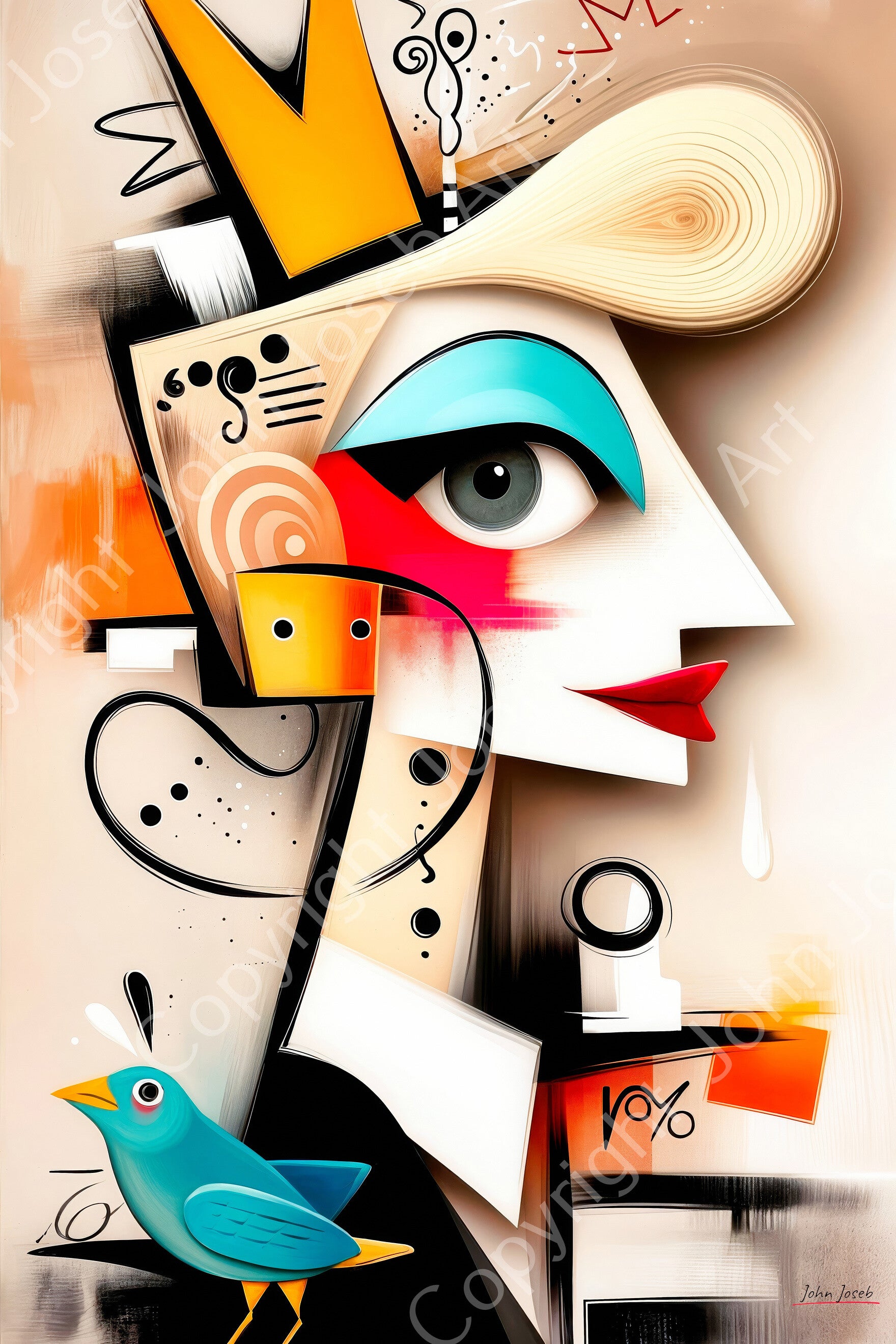 De koningin, vrouw, gek grappig, vogel, portret, abstract in Herman Brood / Picasso stijl, kunst, mens, rood, blauw, oranje, modern