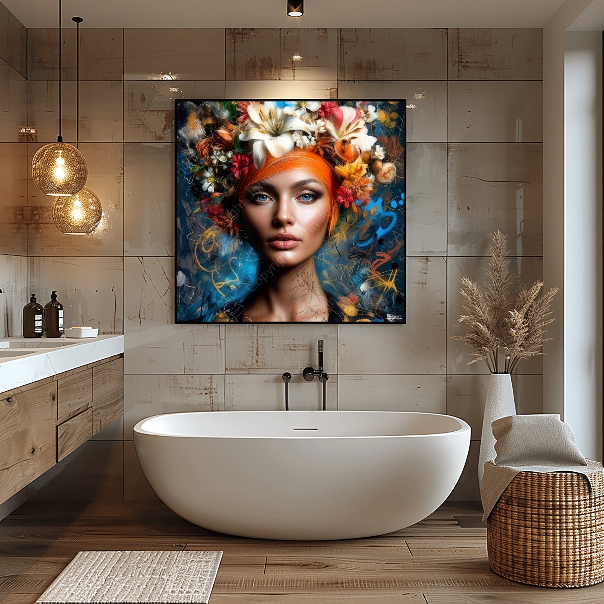 Vrouw met bloemen, abstract, graffiti, portret, gezicht, kleurrijk, vierkant, kunst, mens, blauw, bruin, rood, geel, modern