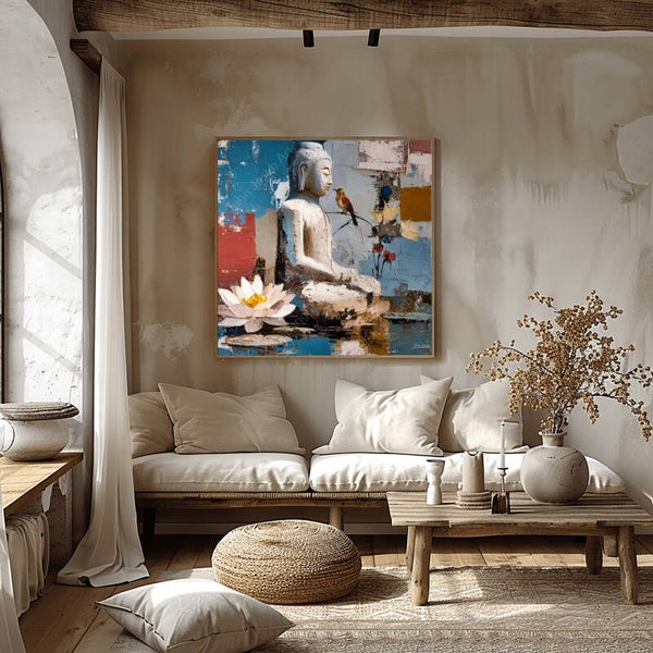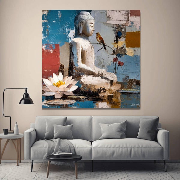 Buddha met lotus bloem en vogel, abstract, vierkant, kunst, Boeddha, rood, blauw, grijs, geel, modern
